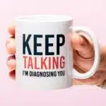 De meeste dingen die wij verkopen zijn zeer geschikt als cadeau. Maar de Mok Blijf praten kun je beter zelf houden. Op de mok staat de tekst: Blijf praten, ik diagnosticeer je. Perfect om te gebruiken op school of je werk. Neem hem mee naar een saaie, ellenlange vergadering, dan heb je in elk geval de lachers op je hand.