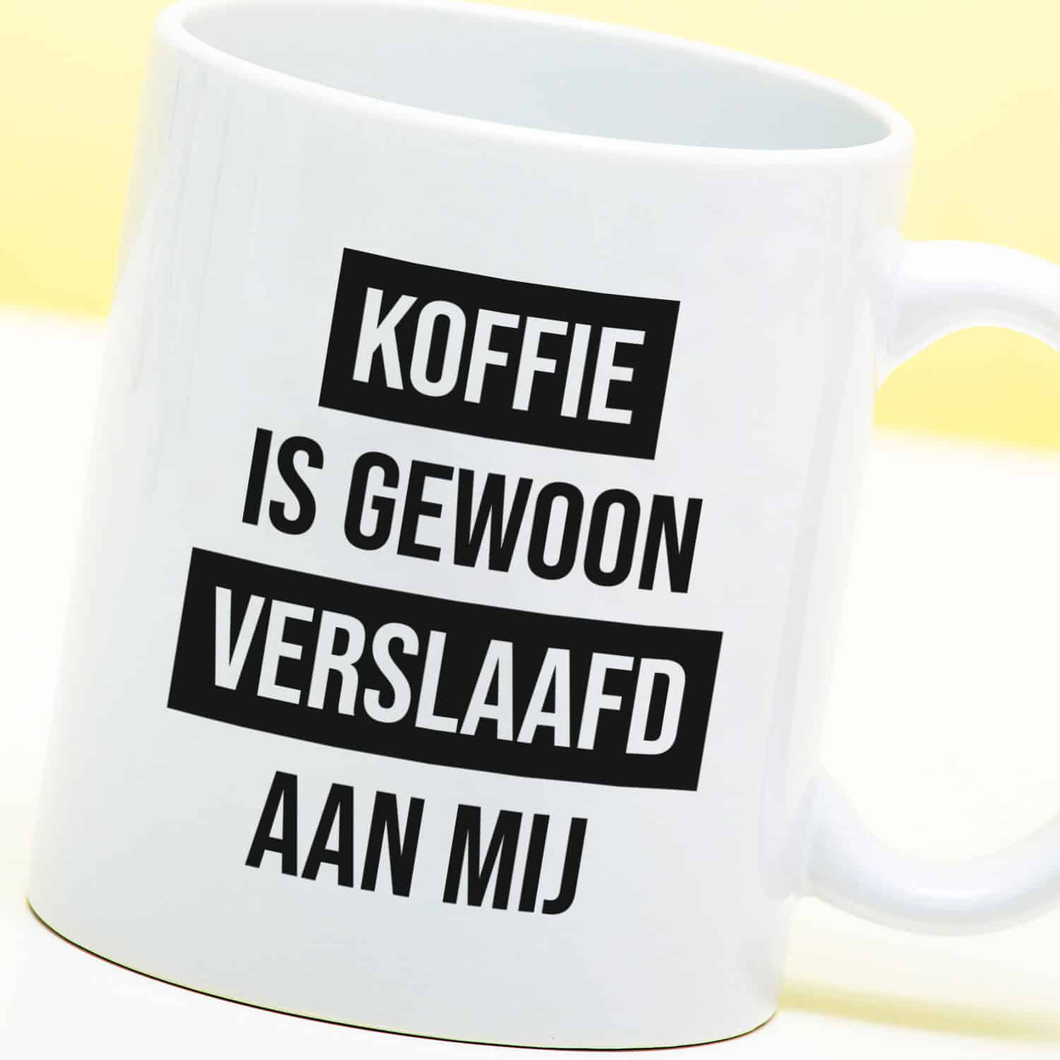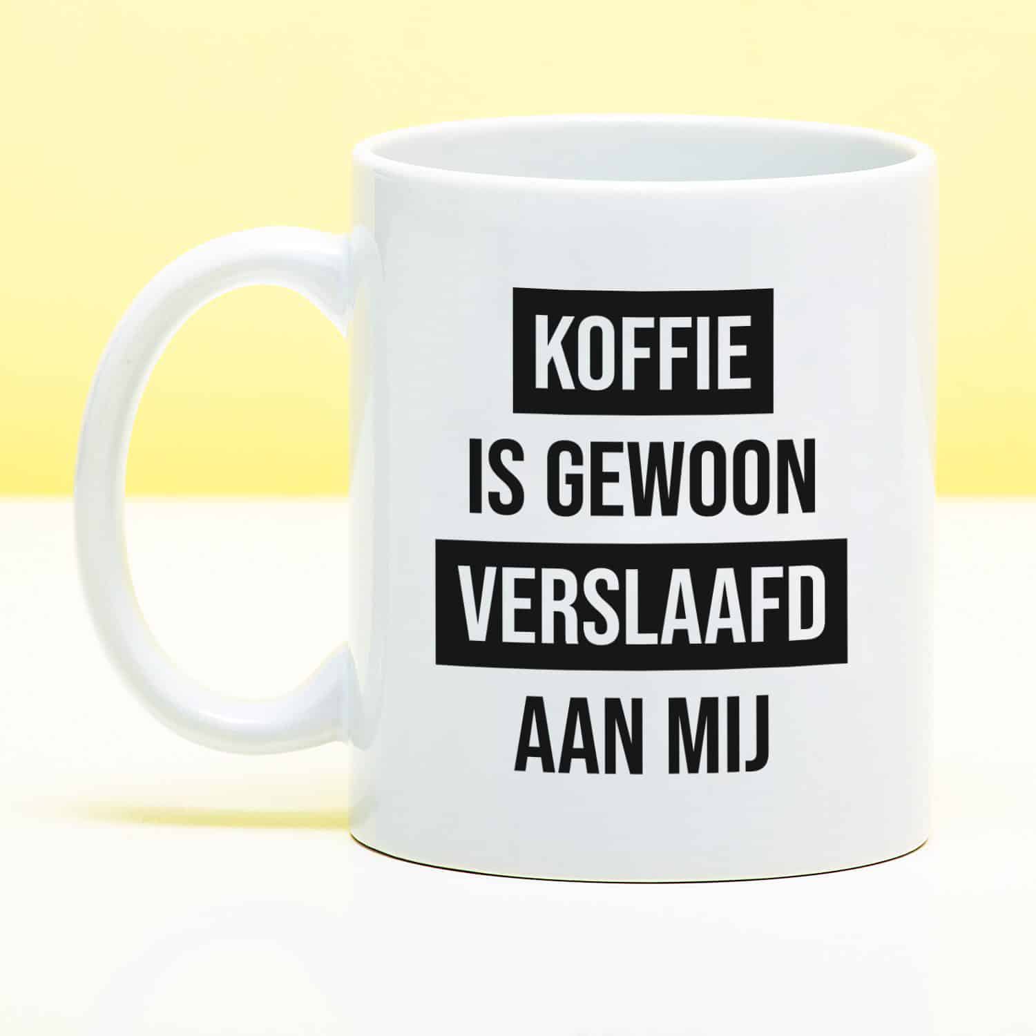 De Mok Koffie is gewoon verslaafd aan mij draait de rollen om: niet jij bent verslaafd aan koffie, maar koffie is verslaafd aan jou. Met deze grappige tekst maak je duidelijk dat je gewoon geen keuze hebt in deze relatie.