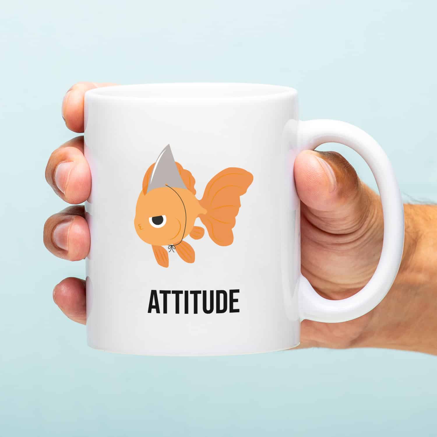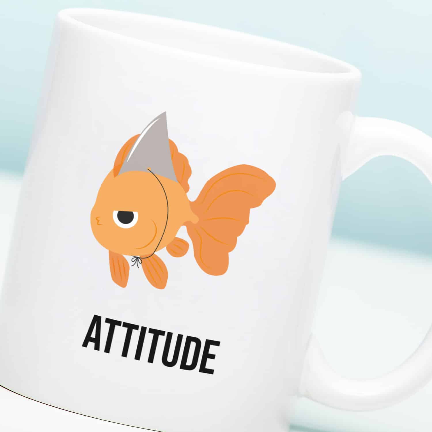 De Mok Attitude laat zien dat formaat er niet toe doet. Met de illustratie van een goudvis met een omgeknoopte haaienvin is dit de perfecte mok voor iedereen met een flinke dosis zelfvertrouwen.