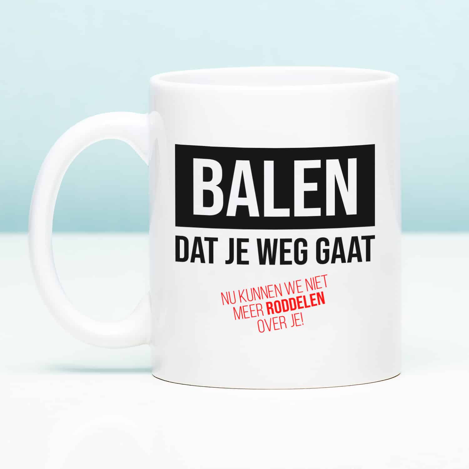 De Mok Balen dat je weggaat is hét afscheidscadeau voor een collega die een nieuwe baan heeft. De mok heeft een grappige ondertoon: over wie moeten jullie nu roddelen? Met dit cadeautje laat je zien dat je je collega stiekem toch gaat missen. Een brutale koffiemok die elk afscheid luchtig maakt.