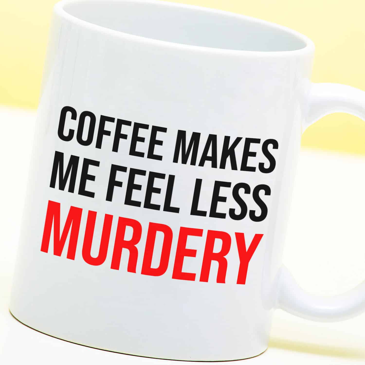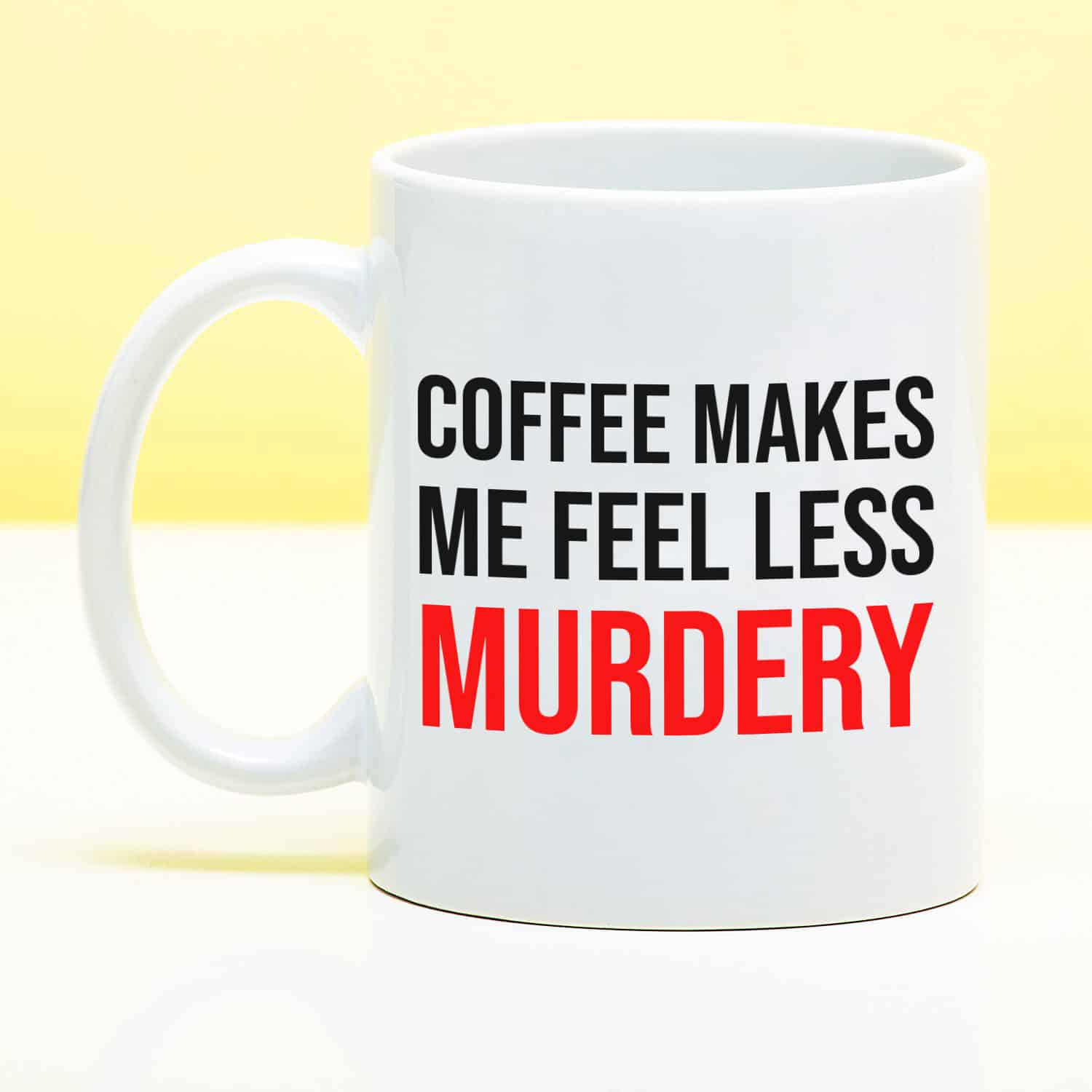 Mok met Tekst ‘’Coffee makes me feel less murdery’’ | Materiaal: Keramiek | 33 cl | Mok met Tekst | Koffie Mok | Grappige Cadeau | Vaatwasser bestendig | Humor | Mok met grappige tekst