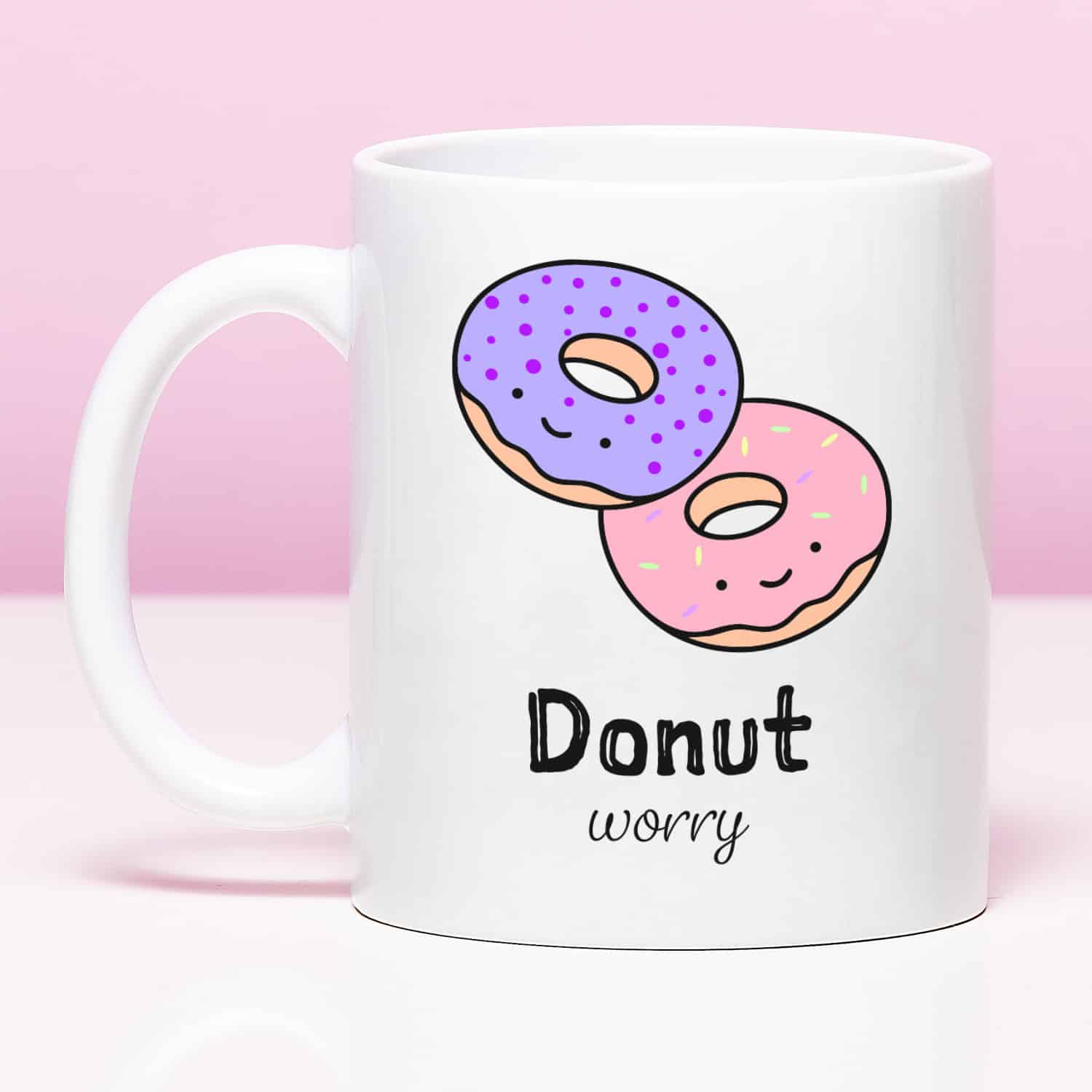 • Grappige mok met donut-illustraties en de tekst: Donut worry