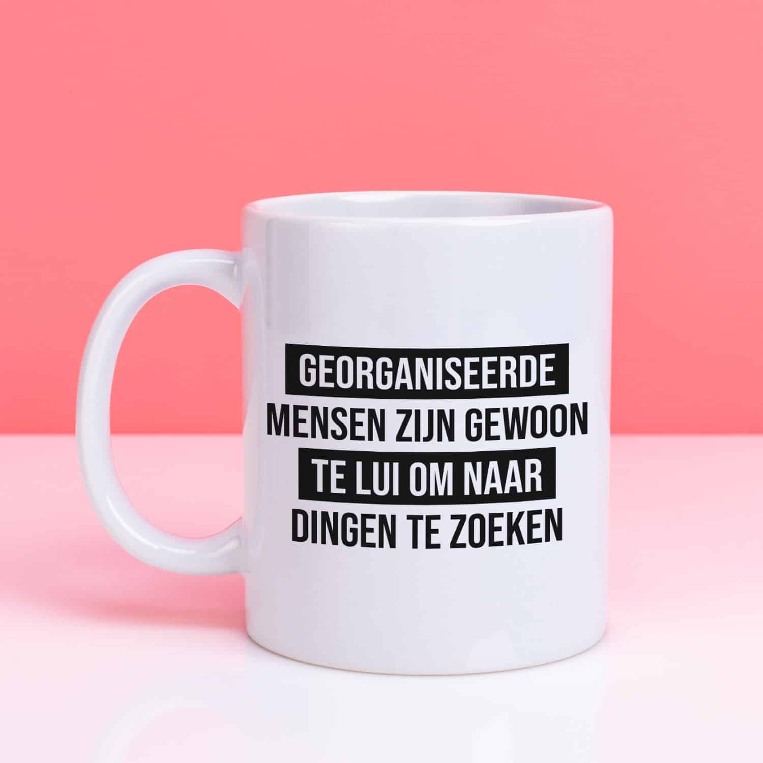 De Mok Georganiseerde mensen is een grappige beker met de tekst: Georganiseerde mensen zijn gewoon te lui om naar dingen te zoeken. Een grappig cadeautje voor de rommelkont, die ook graag zijn dingen direct zou kunnen vinden.