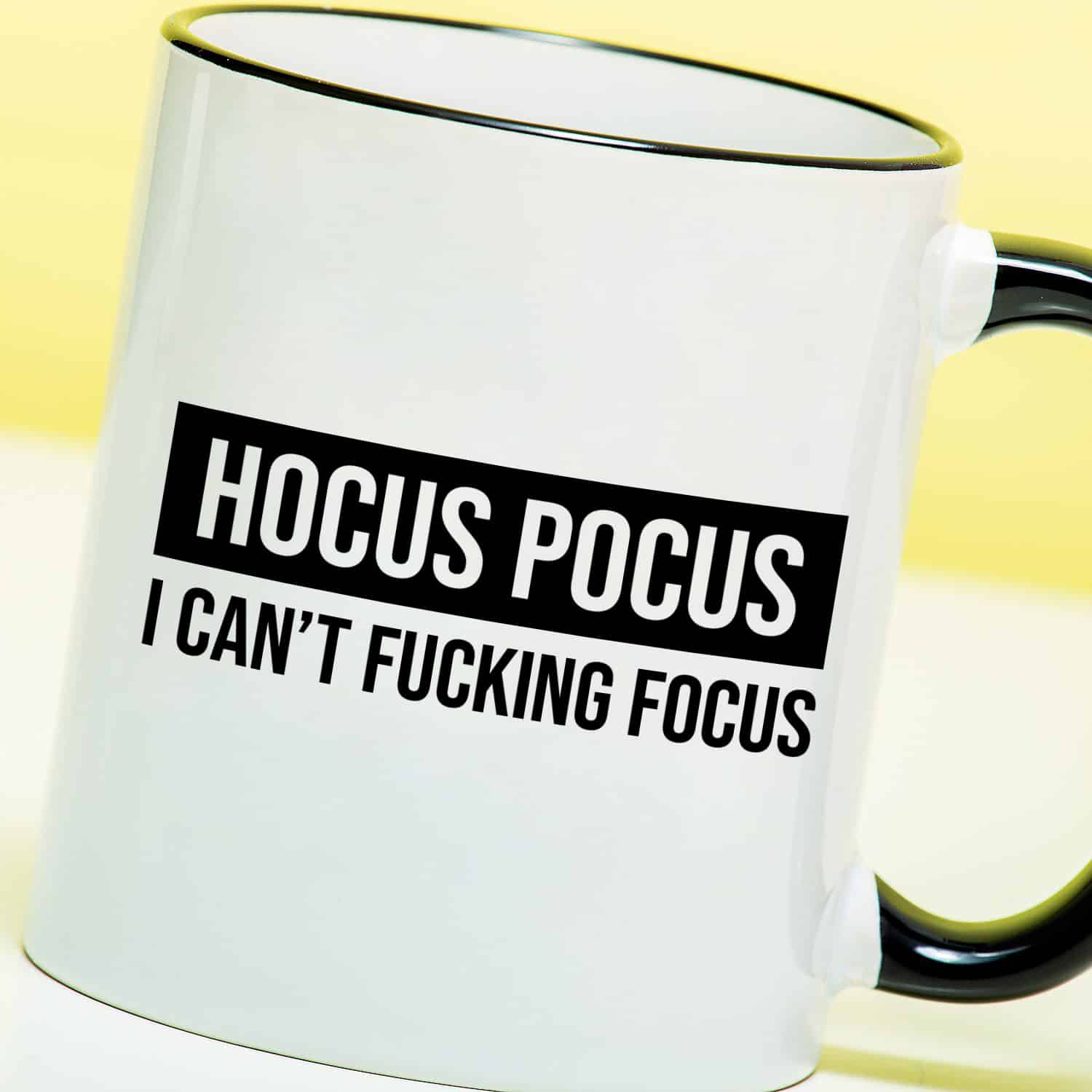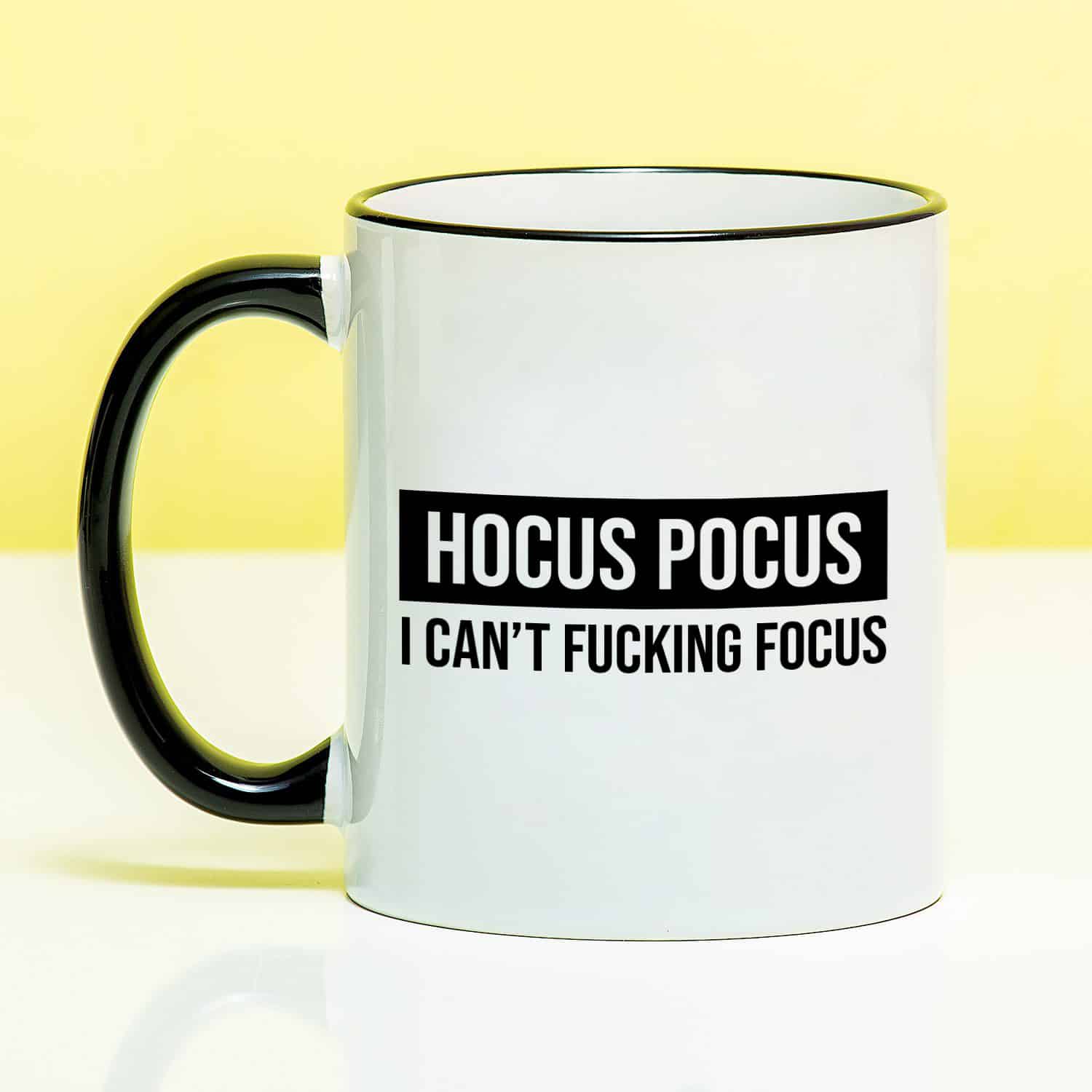 De Mok Hocus Pocus is een hilarische koffiemok voor iedereen die snel afgeleid is. Perfect voor werk, studie of elke dag waarop je je hoofd er écht niet bij kunt houden. Op de beker staat de tekst: Hocus pocus, I can’t fucking focus.