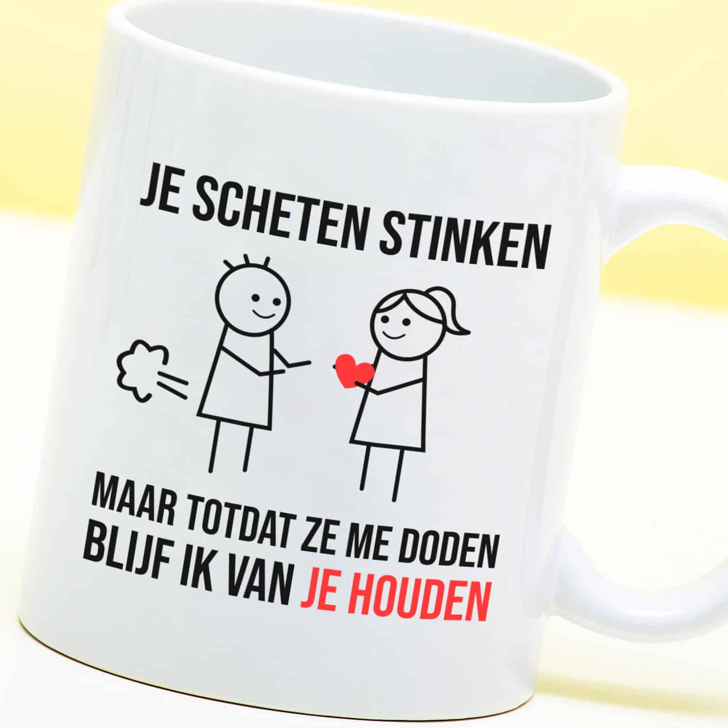 De Mok Je scheten stinken is een hilarische liefdesmok met de tekst Je scheten stinken, maar totdat ze me doden blijf ik van je houden. Een grappige koffiemok die laat zien dat echte liefde alles doorstaat.