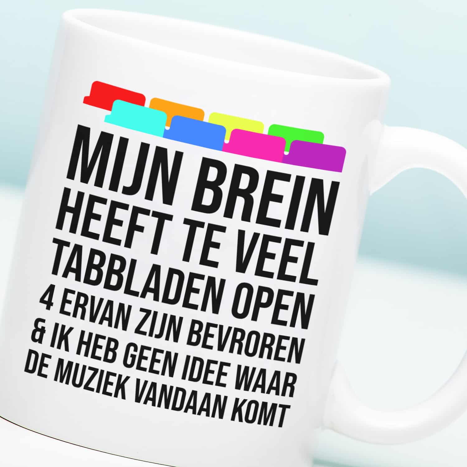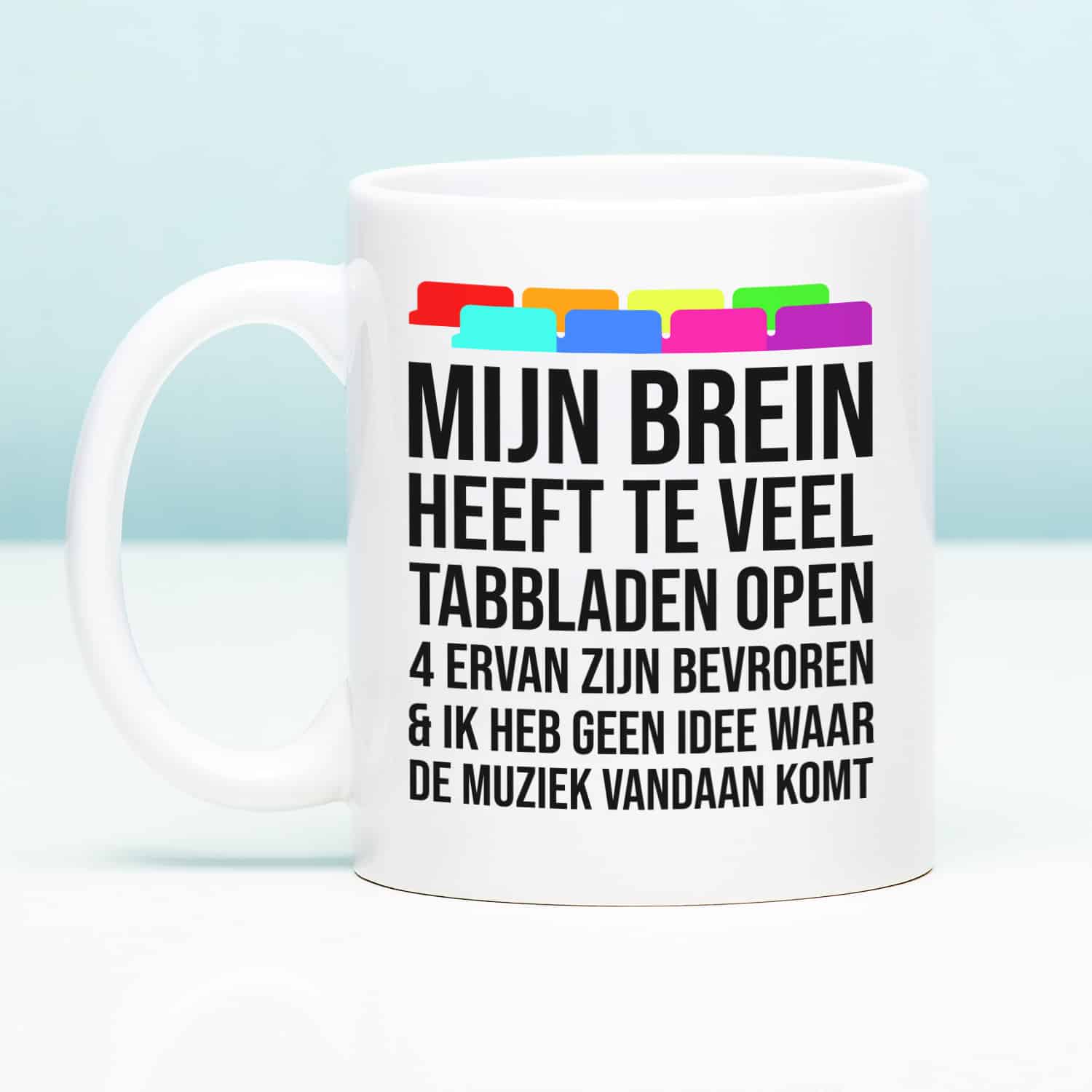 Mok met Tekst ‘’Mijn brein heeft te veel tabbladen open’’ | Materiaal: Keramiek | 33 cl | Mok met Tekst | Koffie Mok | Grappige Cadeau | Vaatwasser bestendig | Humor | Mok met grappige tekst
