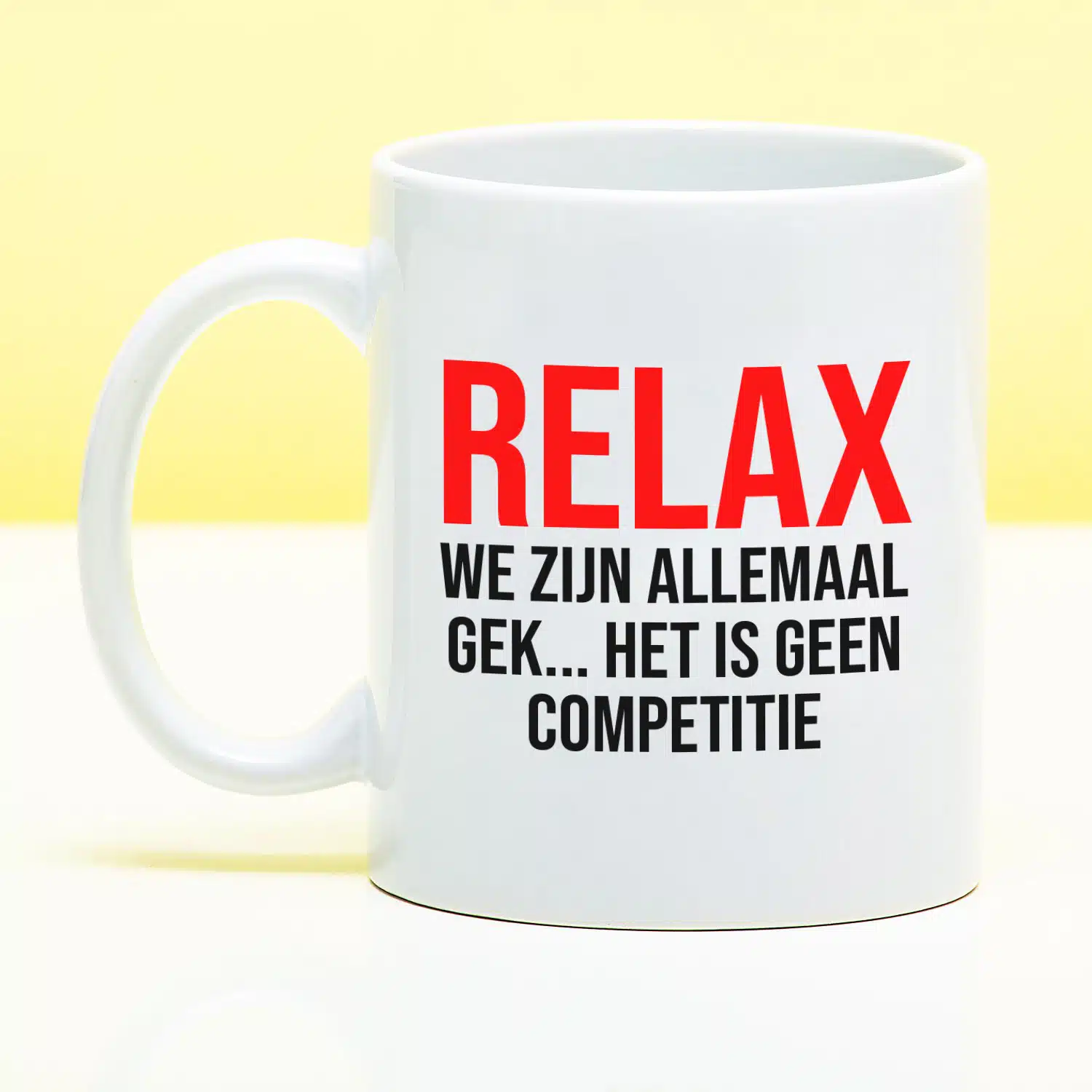Mok met Tekst ‘’Relax we zijn allemaal gek’’ | Materiaal: Keramiek | 33 cl | Mok met Tekst | Koffie Mok | Grappige Cadeau | Vaatwasser bestendig | Humor | Mok met grappige tekst