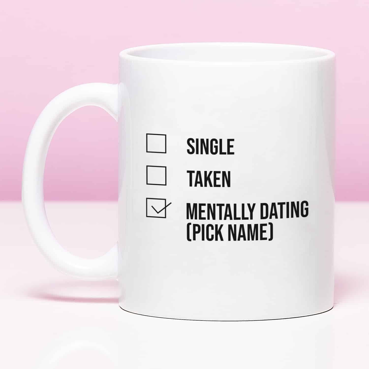 De Mok Single Dating is voor iedereen die officieel single is, maar in hun hoofd al een hele relatie heeft. Met een checklist met opties Single, Taken en Mentally dating (pick name), maak je duidelijk hoe complex de moderne relatiesstatus is.