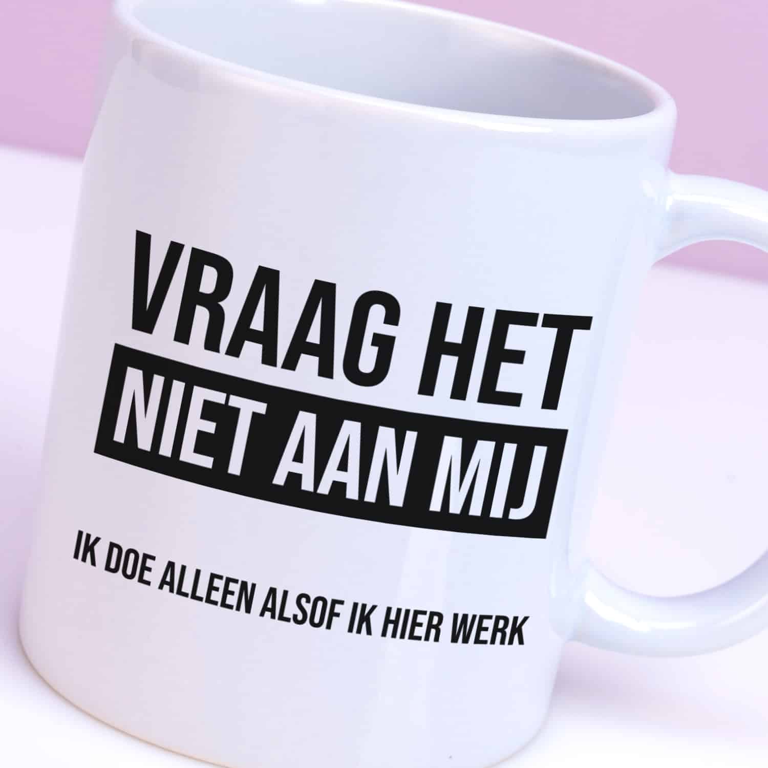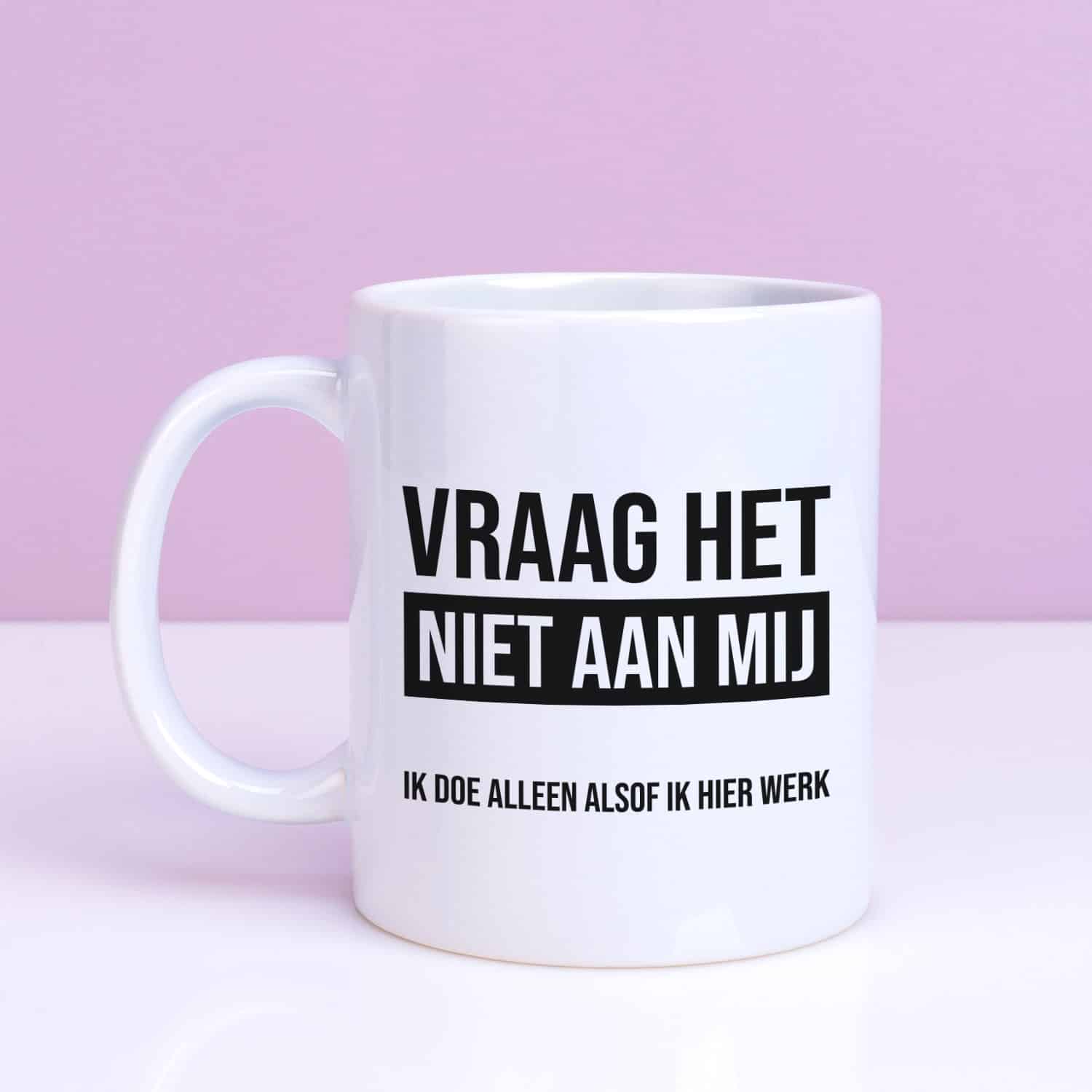 De Mok Vraag het niet aan mij is perfect voor iedereen die vooral expert is in net doen alsof. Een humoristische koffiemok waarmee je op kantoor duidelijk maakt dat jij niet de aangewezen persoon bent voor lastige vragen.
