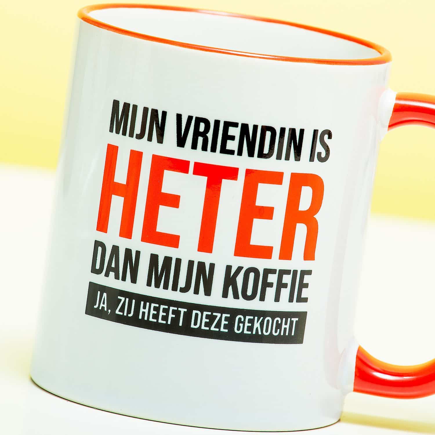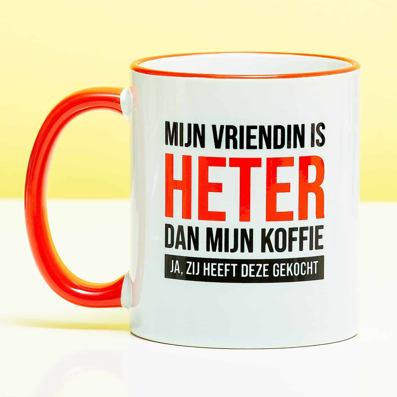 Je partner mag blij zijn dat jij zijn of haar partner bent. En iedereen mag dat weten ook! De Mok Mijn vriendin is heter dan mijn koffie is een grappige beker om cadeau te geven aan je geliefde. Op de mok staat de tekst: Mijn vriendin is heter dan mijn koffie. Ja, zij heeft deze gekocht. Je hoeft je lief nu alleen nog maar te dwingen om deze mok mee te nemen naar het werk.