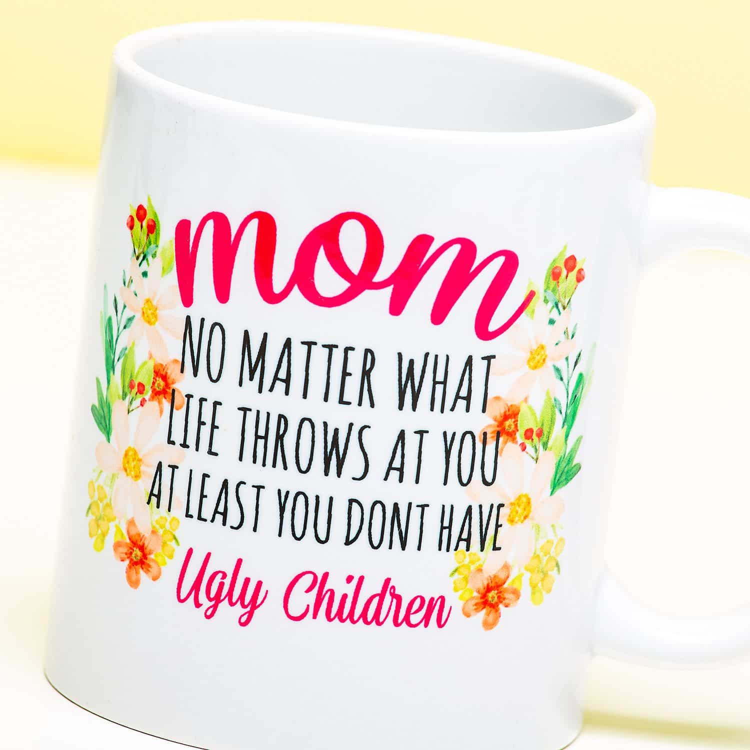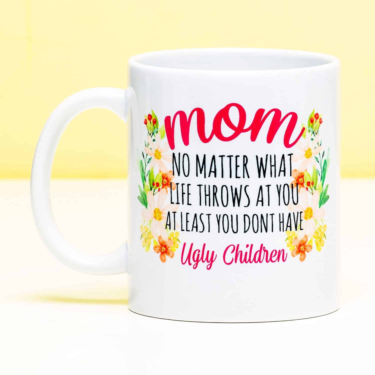 Wat er ook gebeurt, gelukkig heeft ze geen lelijke kinderen. Dus dat is een reden voor je moeder om tevreden te zijn, toch? Geef je mams de No Ugly Children mok cadeau voor haar verjaardag of Moederdag. Op de witte mok staat de tekst Mom, No Matter What Life Throws At You, At Least You Don’t Have Ugly Children samen met een vrolijke bloemenprint. Dat is nou nog eens knap omdenken! Door de hoge kwaliteits opdruk kan de beker gewoon in de vaatwasser en magnetron.