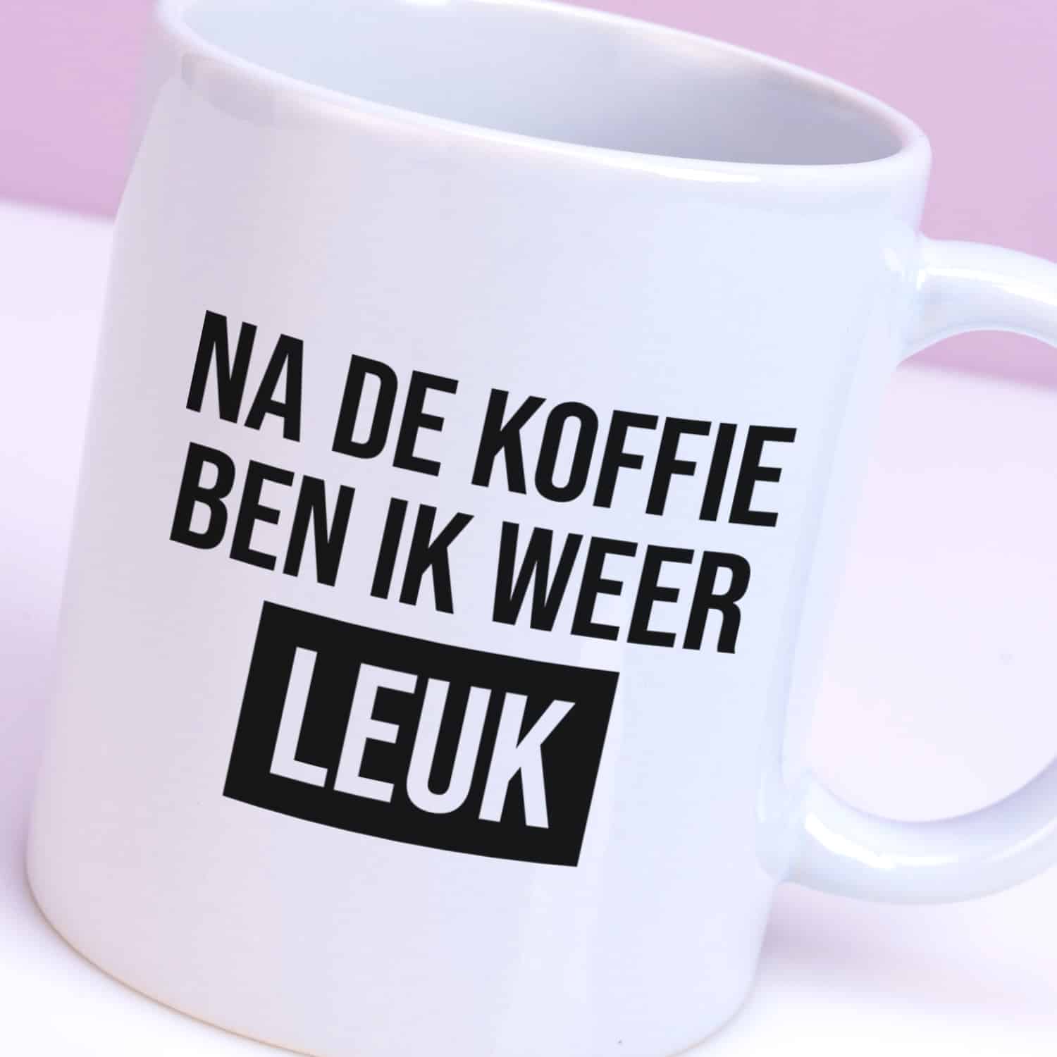 Hoeveel koppen koffie heb jij nodig om je ‘s ochtends weer helemaal jezelf te voelen? Laat je collega’s of gezin weten dat ze je nog even met rust moeten laten, met de Mok Na de koffie ben ik weer leuk. Op de beker staat precies die tekst: Na de koffie ben ik weer leuk. Deze grote koffiemok is perfect voor mensen die even rustig willen opstarten met een kop koffie.