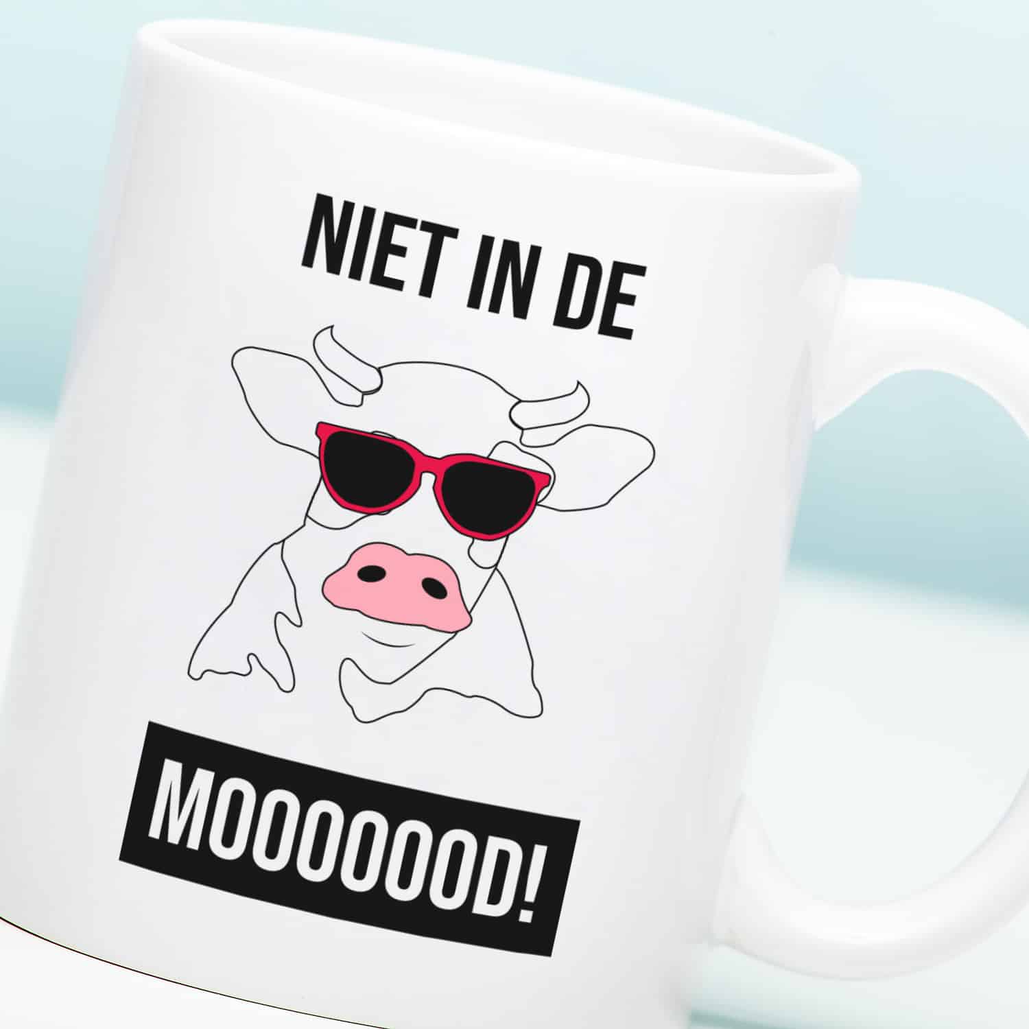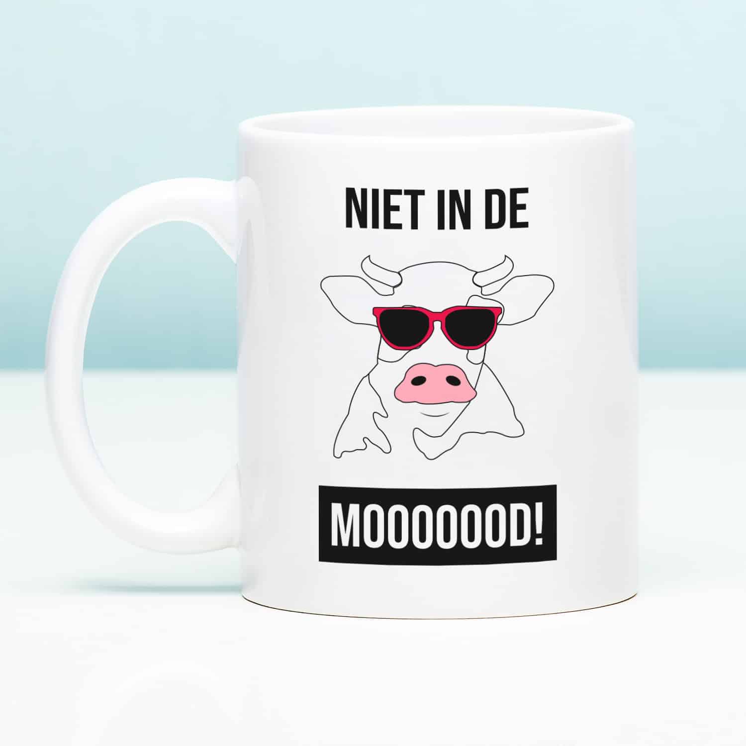 De Mok Niet in de moooood! laat meteen zien hoe je je voelt. Met de grappige koe-illustratie en de tekst is dit de perfecte beker voor ochtenden waarop je met rust gelaten wilt worden.