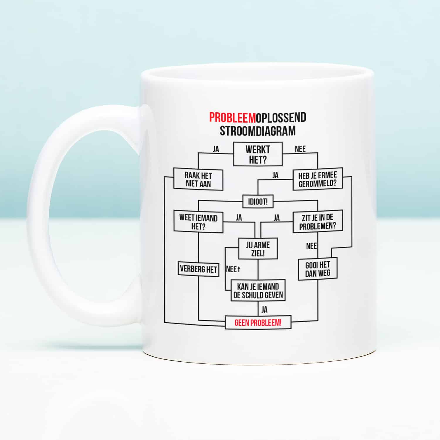 De Mok Probleemoplossend stroomdiagram is een must-have voor iedereen die het overzicht kwijt is zodra er iets misgaat. Op de beker staat een hilarisch schema dat je stap voor stap uitlegt wat je moet doen: van “raak het niet aan” tot “kan je iemand de schuld geven?”. Een koffiemok die elke werkplek een stuk grappiger maakt.