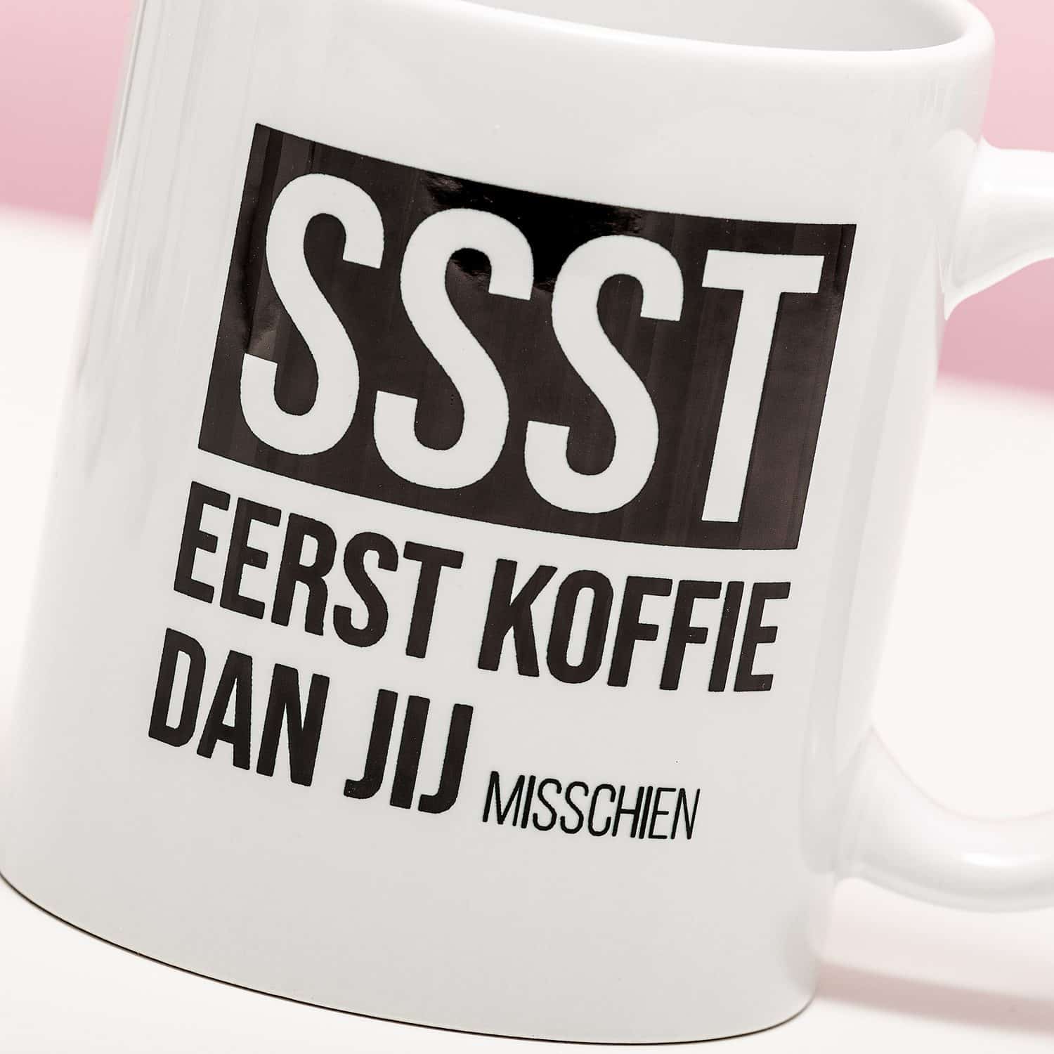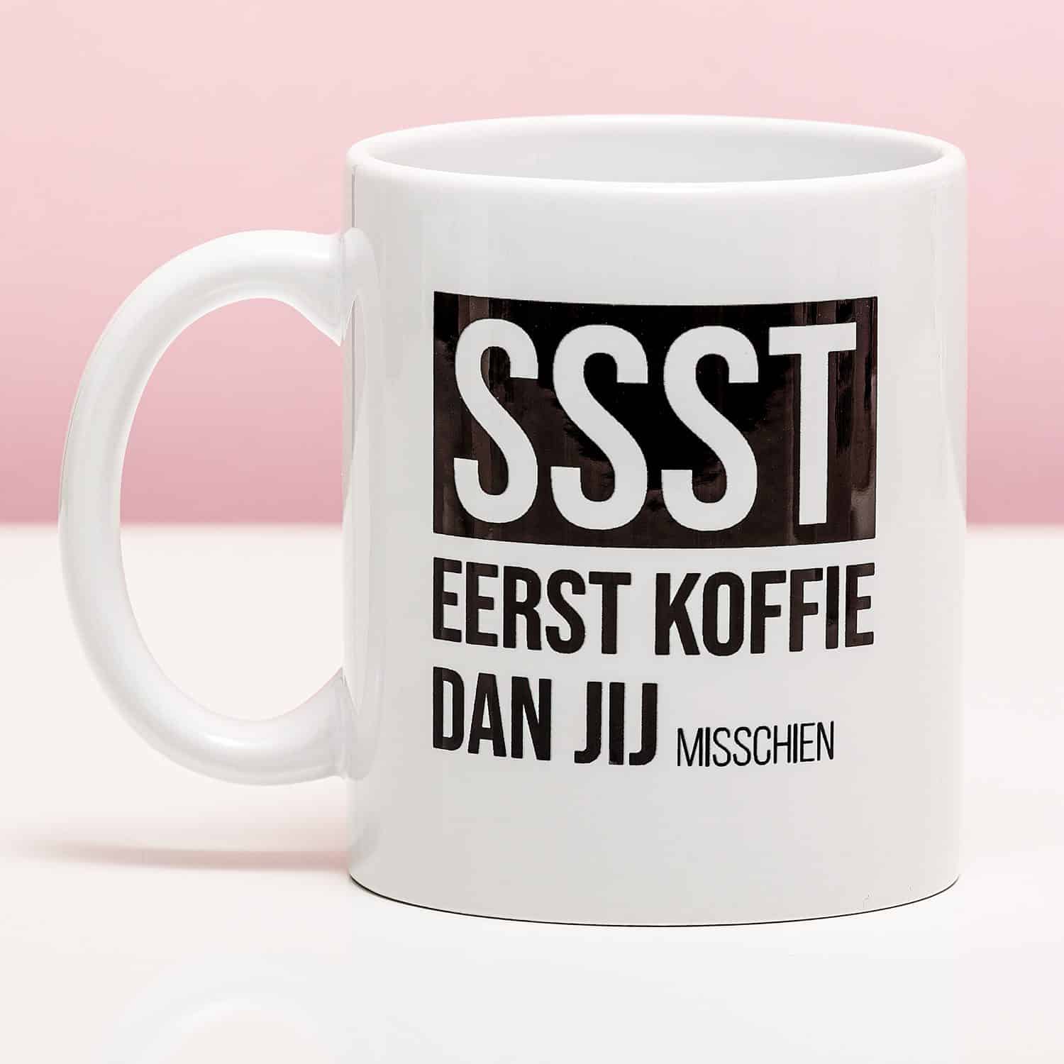 Word je helemaal gek van collega’s die al aan je bureau staan als je je jas nog aan hebt? Nog voordat je je eerste bak koffie hebt gehad? Druk ze de Mok Ssst eerst koffie in handen. Op de mok staat de tekst: SSST. Eerst koffie, dan jij (misschien). Een subtiele hint dat ze eerst even koffie voor je moeten halen.