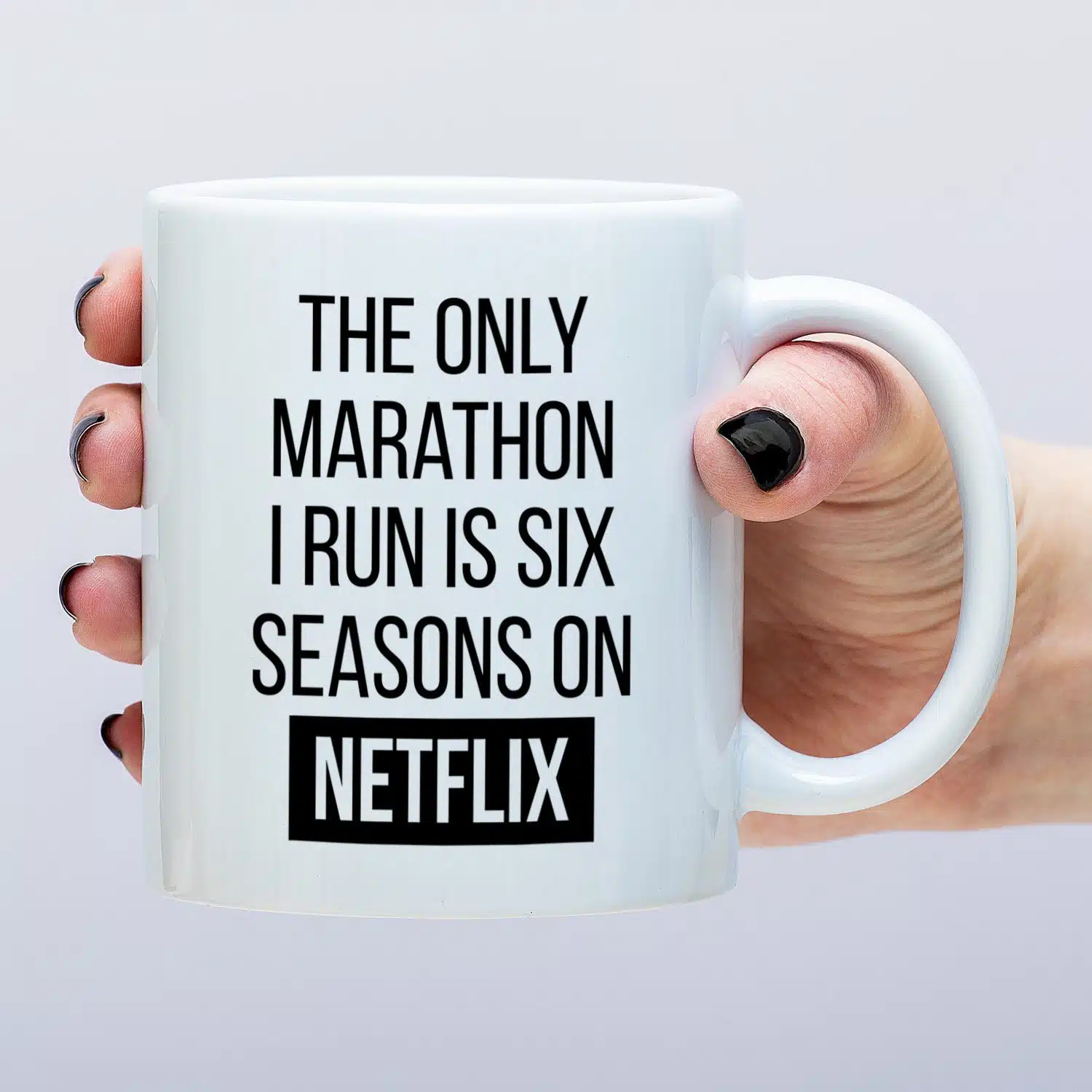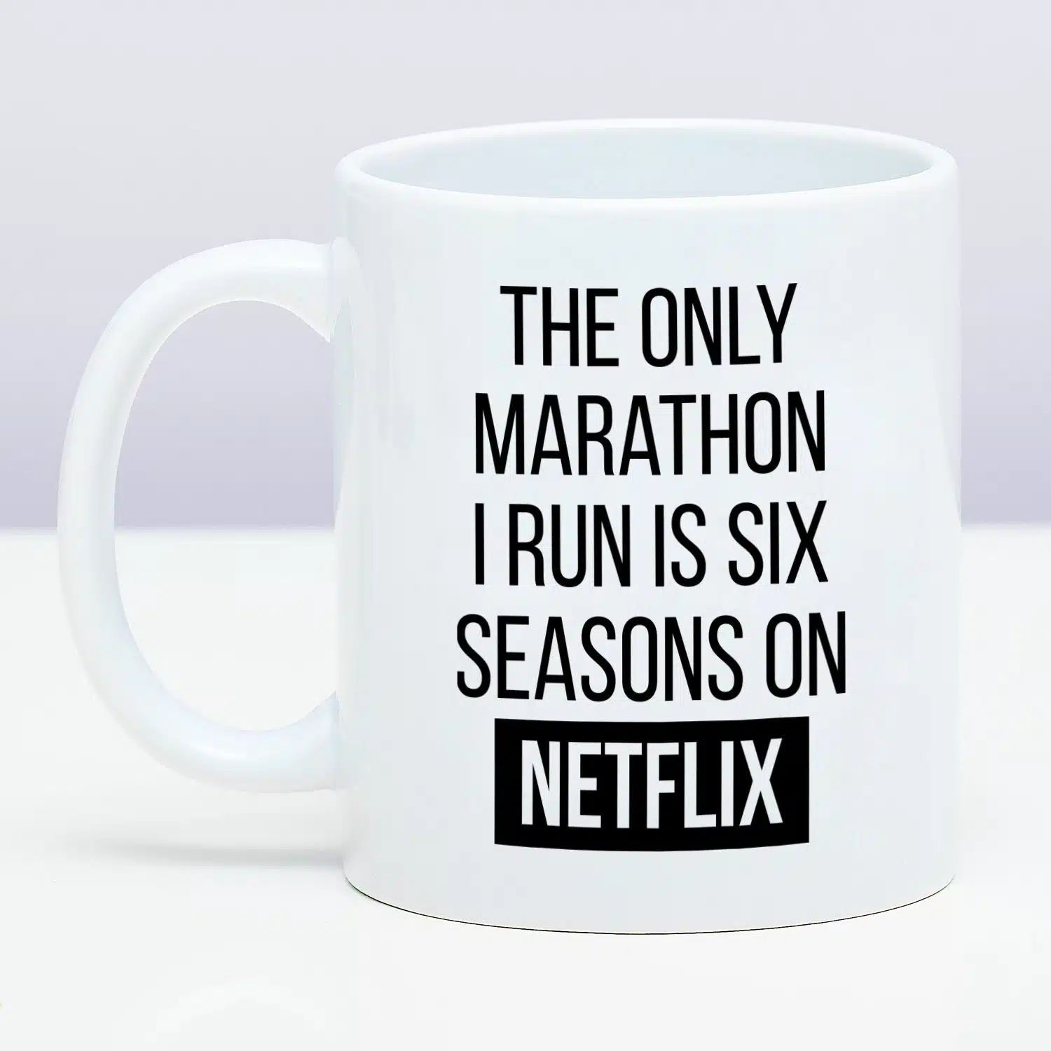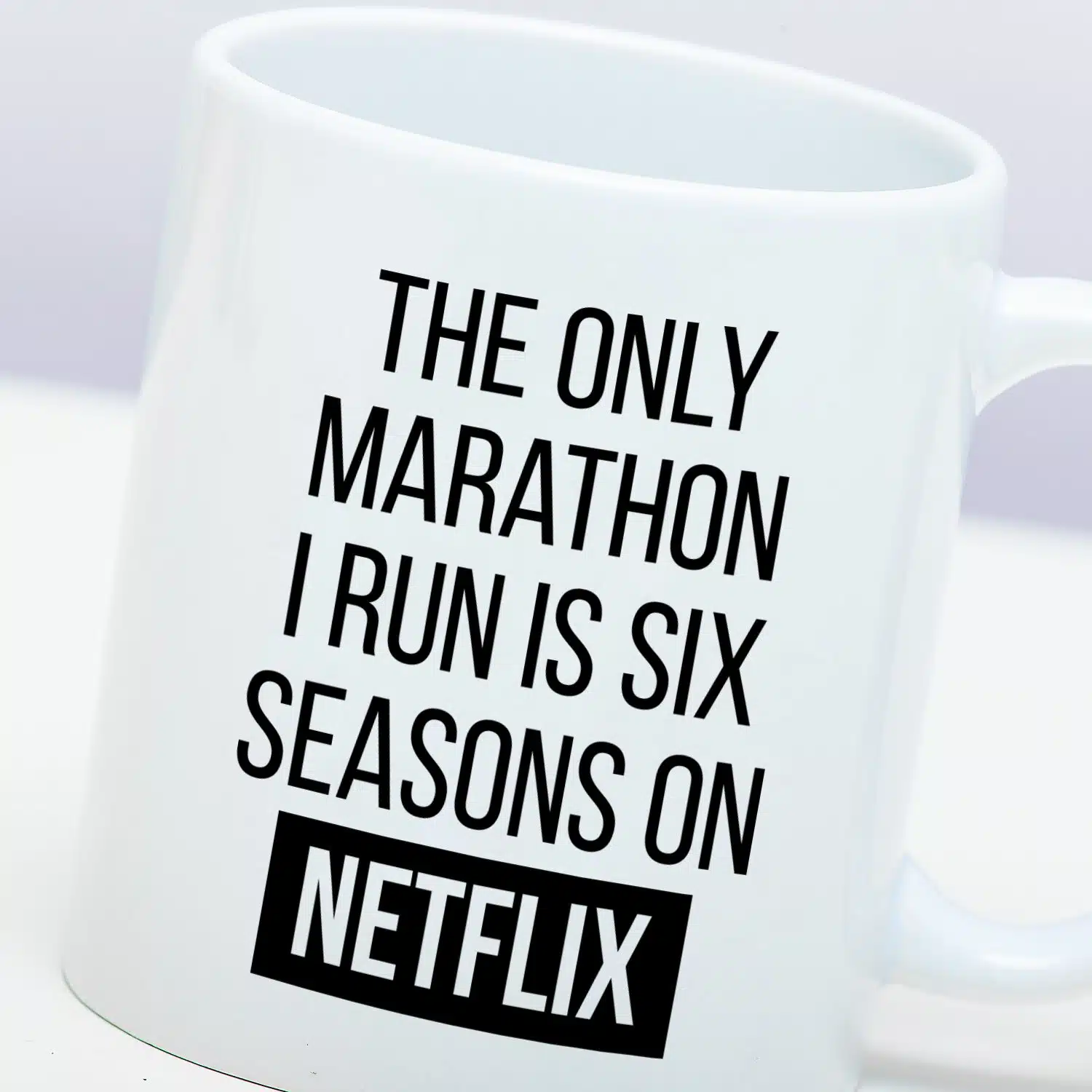 Met de komst van streamingsdiensten is er ook een nieuw soort marathons ontstaan. Eentje waarvoor je niet hoeft te trainen en je ook niet voor in het zweet hoeft te werken: de Netflix marathon. De Mok The Only Marathon I Run is speciaal ontworpen voor mensen die uitsluitend dat soort marathons beoefenen. Op de beker staat de tekst: The only marathon I run is six seasons on Netflix.