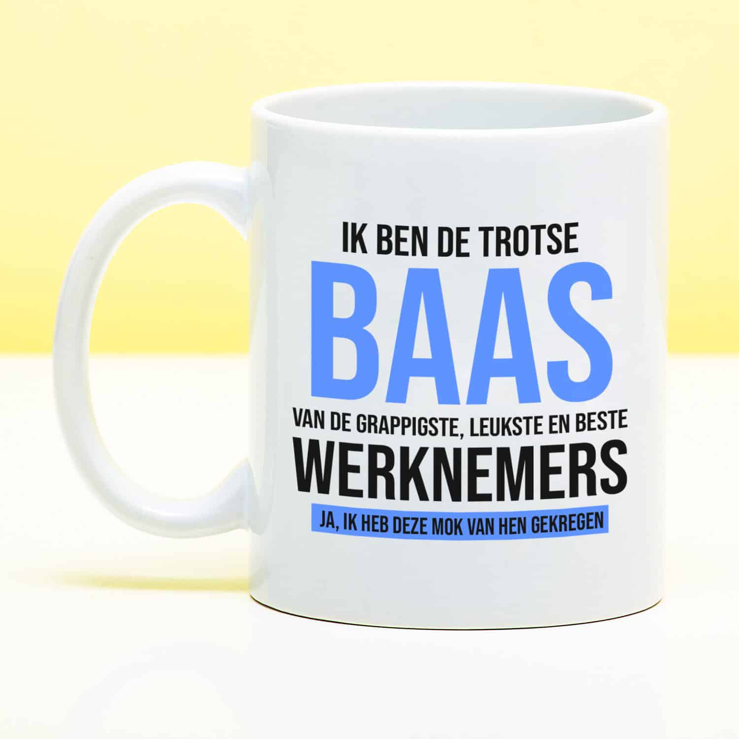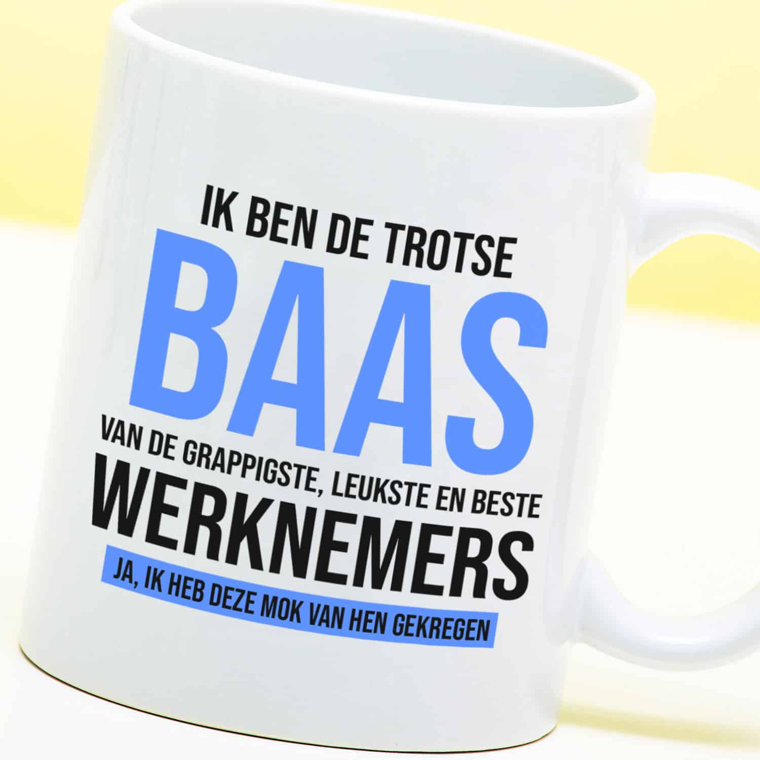 Grappige mok om cadeau te geven aan je werkgever. Op de mok staat de tekst: Ik ben de trotse baas van de grappigste, leukste en beste werknemers. Ja, ik heb deze mok van hen gekregen.