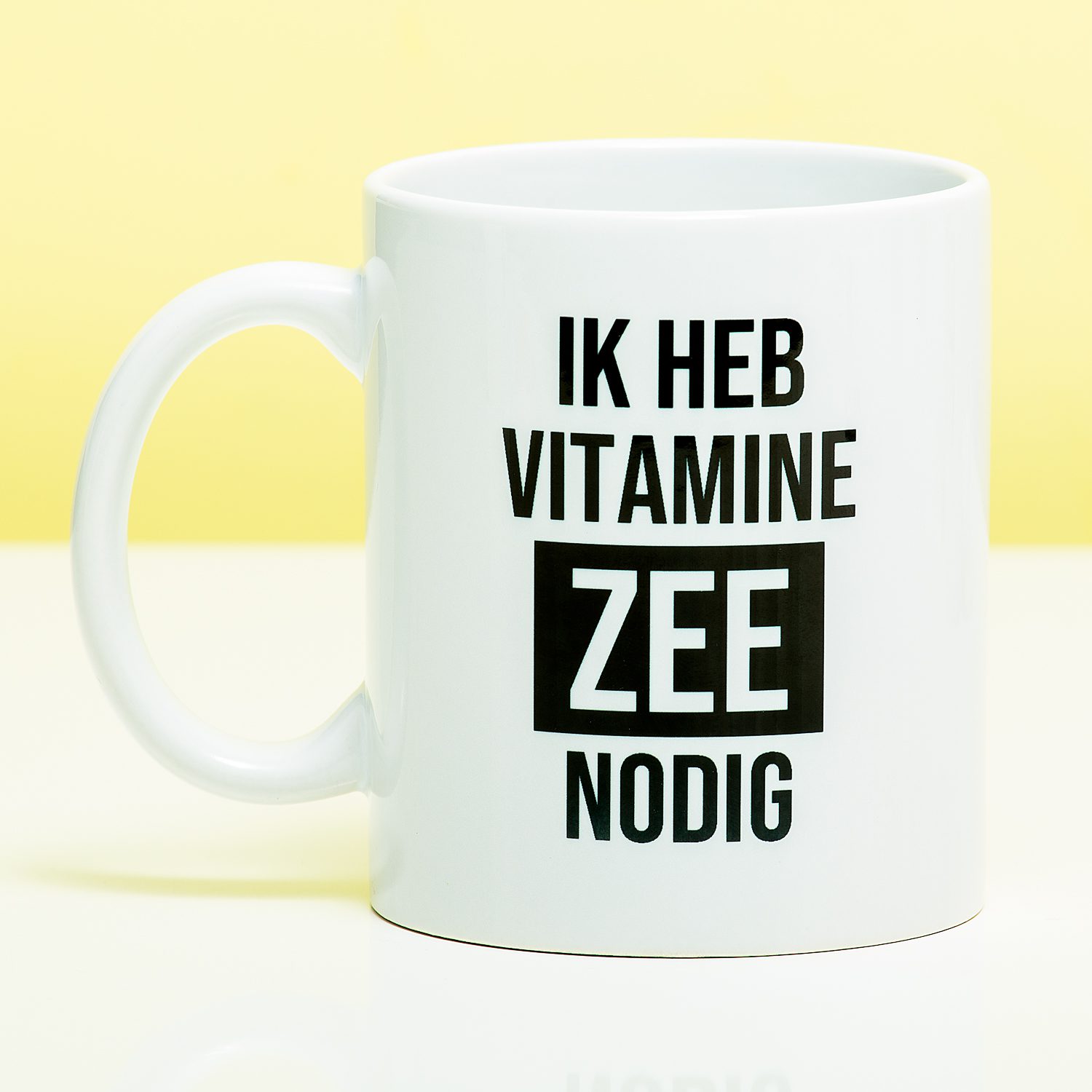 Spijbelen van school of van het werk: beter van niet, maar soms heb je echt even behoefte aan vitamine zee. Toch? De Mok Vitamine zee laat je even wegdromen naar tropische bounty-stranden, maar ook gewoon naar de plas om de hoek. Op deze grappige mok staat de tekst: Ik heb vitamine zee nodig.