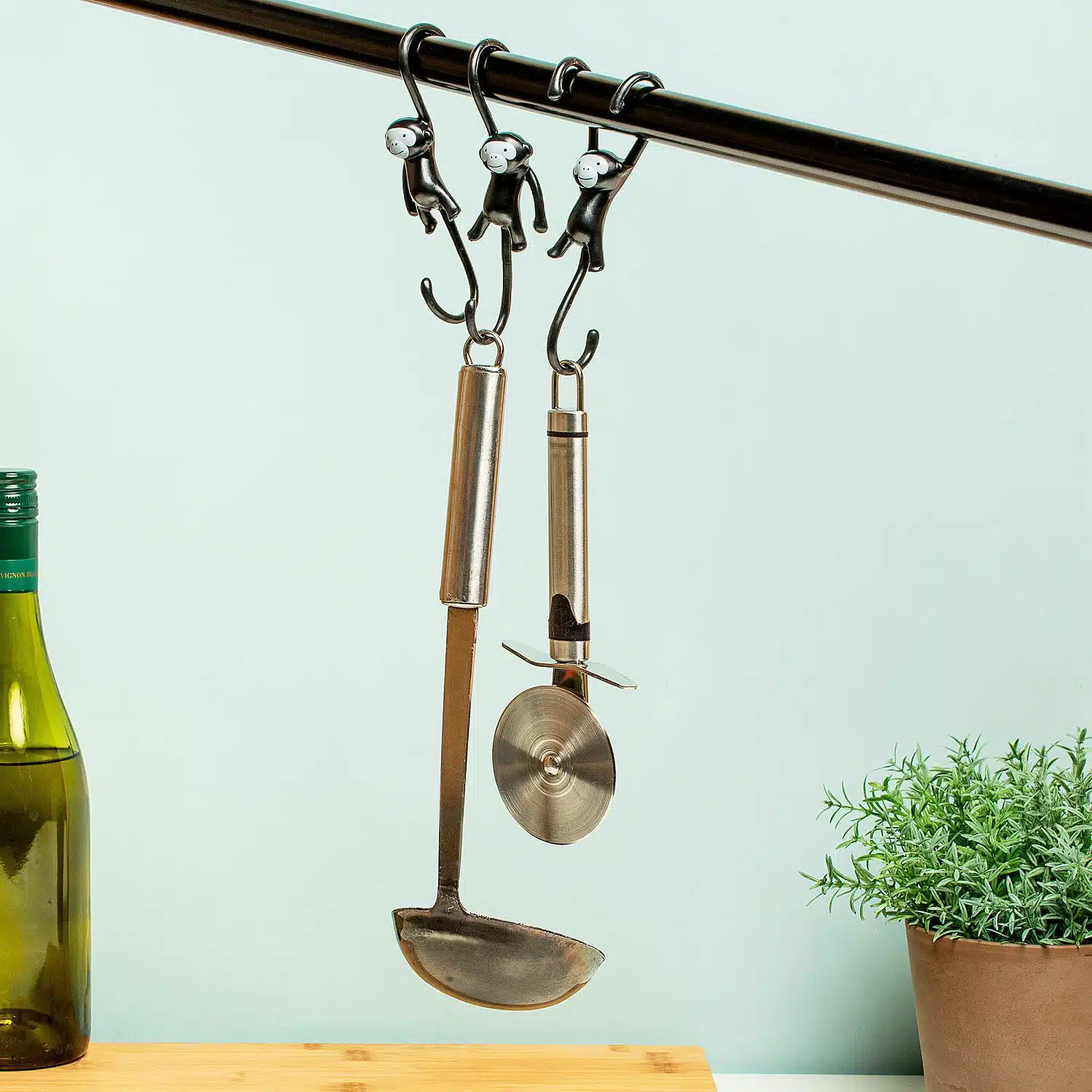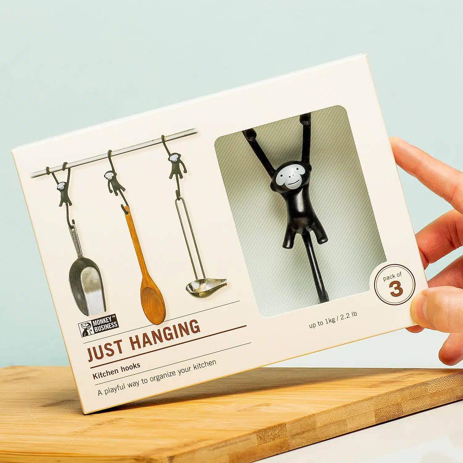 De Just Hanging keukenhaken van Monkey Business vormen een grappig én handig accessoire in elke keuken. Deze keukenhaakjes hebben de vorm van drie aapjes met ondeugende snoetjes. Ook al kijken ze heel baldadig, ze kunnen je uitstekend helpen. Met één of twee apenpootjes houden ze zich vast aan jouw keukenrek en met hun staartjes houden ze al het keukengerei of de theedoek netjes op z’n plaats. Wanneer er geen keukengerei hangt, vermaken de aapjes zich met schommelen. Af en toe maken ze zelfs een lange slinger door onder elkaar te gaan hangen. Zo toveren ze vaak een lach op het gezicht van de kok.