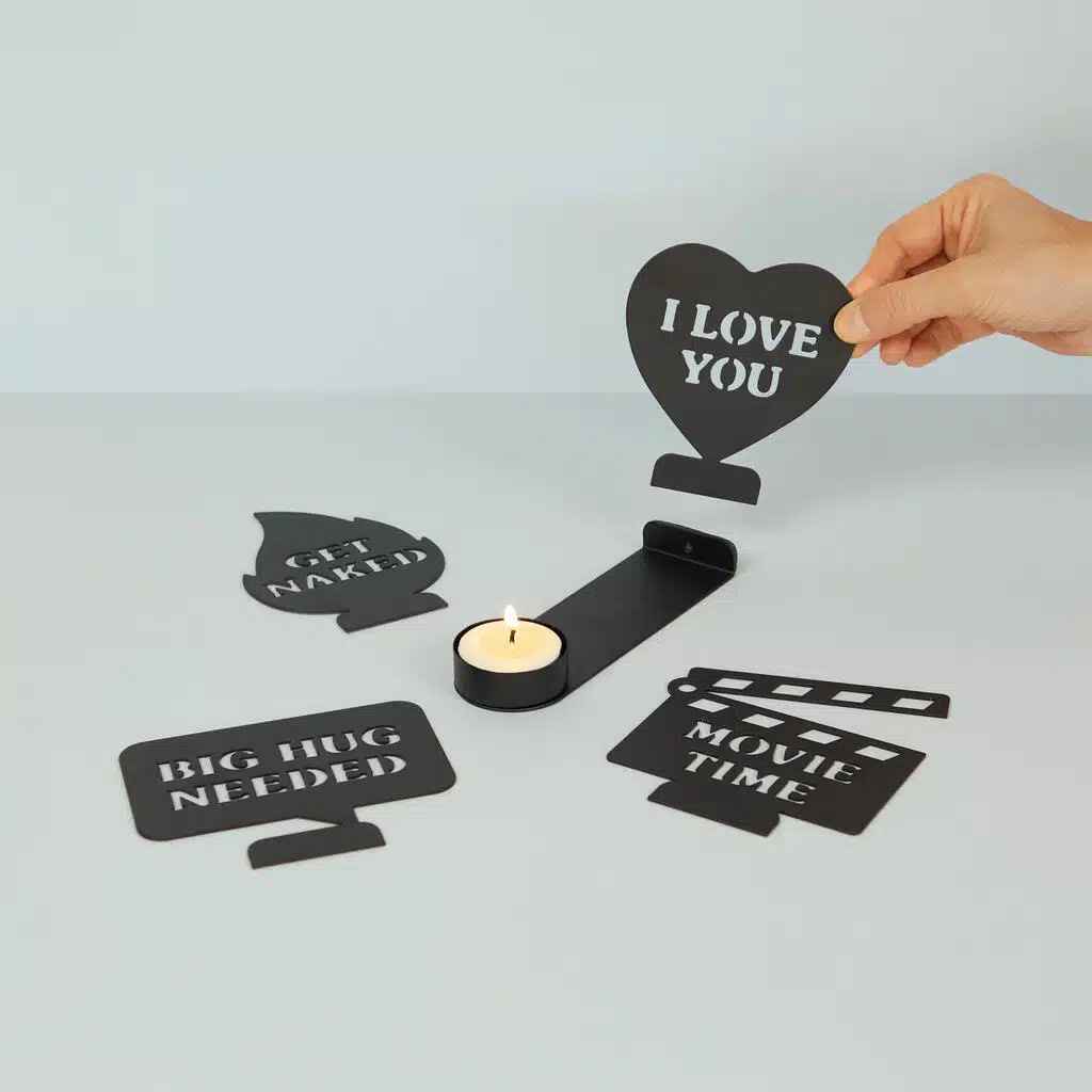 De Moods waxinelichthouder van Balvi is een waxinelichthouder die je boodschap op de muur projecteert zodra je het kaarsje aansteekt. Met 4 verschillende magnetische boodschappen wissel je makkelijk van mood: van romantisch tot grappig, afhankelijk van hoe je je voelt (of wat je wilt bereiken). Creëert een warme sfeer met een beetje magie en veel mogelijkheden om indruk te maken. Perfect cadeau om die speciale persoon te verrassen zonder dat je iets hoeft te zeggen. Laat de vlam voor je spreken!