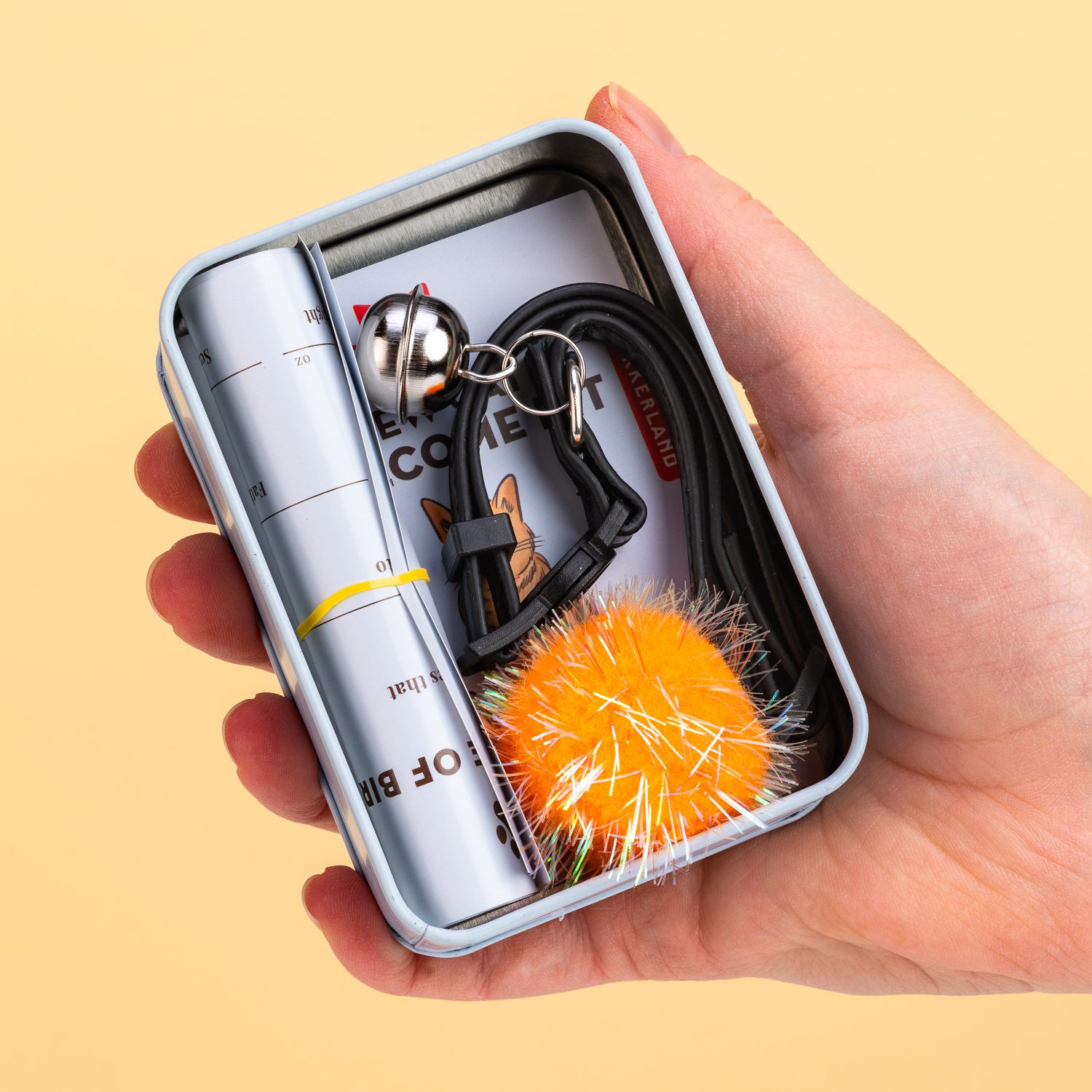Voor je met een nieuwe kat thuis komt, heb je natuurlijk al heel wat onderzoek gedaan. Je hebt een lekker mandje en ook de speeltjes liggen klaar. Met de New Cat Welcome kit van Kikkerland haal je ook snel een paar praktische dingen in huis. In dit leuke blikje zit een halsband met belletje, een speelballetje, twee certificaten (voor geboorte en adoptie) en een handleiding met dingen waar je aan moet denken.