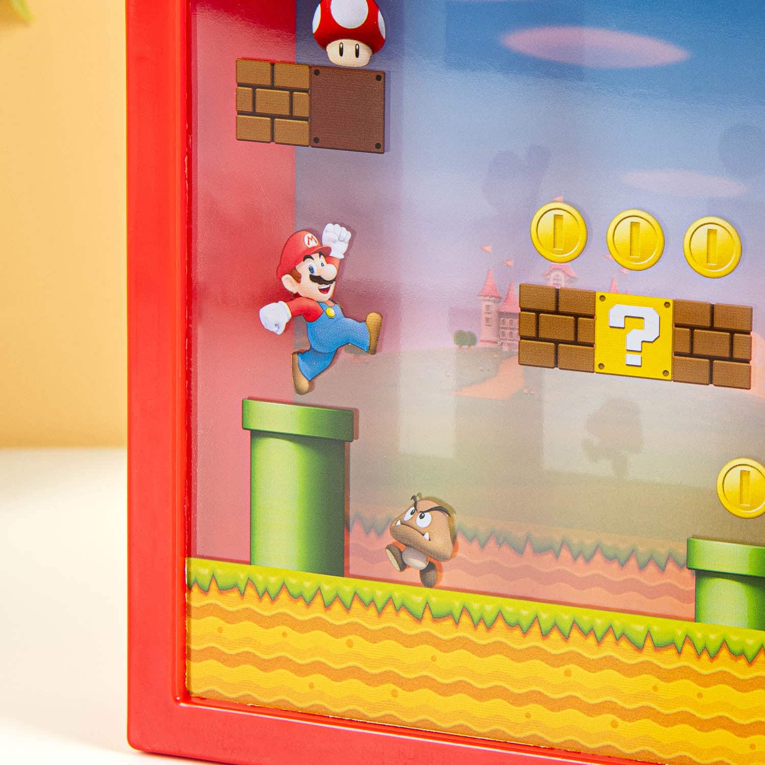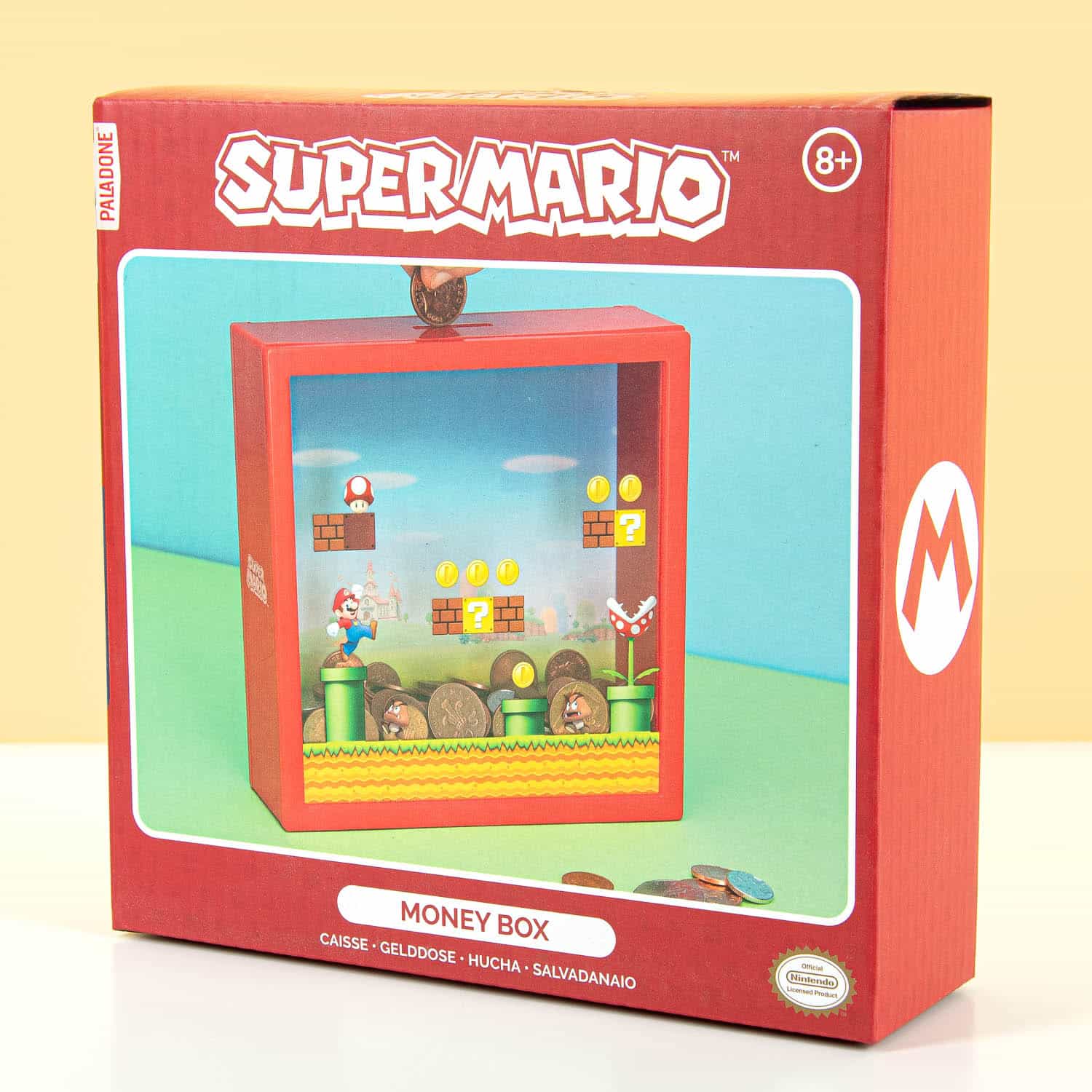 Super Mario Bros was dé hit onder gamers vroeger. En het is nog steeds een populair spel, dat warme gevoelens oproept bij mensen die het vroeger speelden. Voor jonge fans is er de Super Mario spaarpot van Nintendo. Hiermee kunnen zij sparen voor hun volgende spel. De spaarpot heeft het herkenbare design van het spel, met natuurlijk Super Mushroom, Goomba, Piranha Plant en natuurlijk Super Mario. De spaarpot heeft een gleuf aan de bovenkant voor muntgeld. Omdat de voorkant transparant is, kun je je geld ook zien zitten.