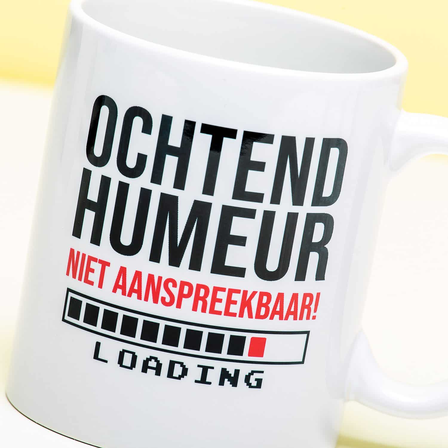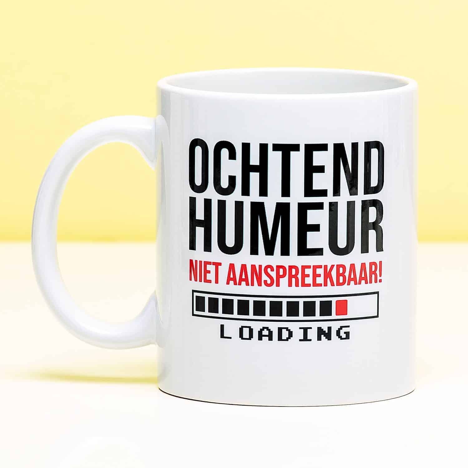 Heb je een super chagrijnige collega op je werk? Of een partner die niet te genieten is in de ochtend? Of heb je zelf een gigantisch ochtendhumeur en wil je liever niet worden aangesproken? Met de Ochtendhumeur Niet Aanspreekbaar mok maak jij iedereen duidelijk hoe jij je voelt. Deze grappige beker heeft de tekst Ochtendhumeur, niet aanspreekbaar. Daaronder staat een laadbalk, met daaronder het woord loading. Een grappig en origineel cadeautje, dat je beter niet ‘s ochtends vroeg kunt geven.