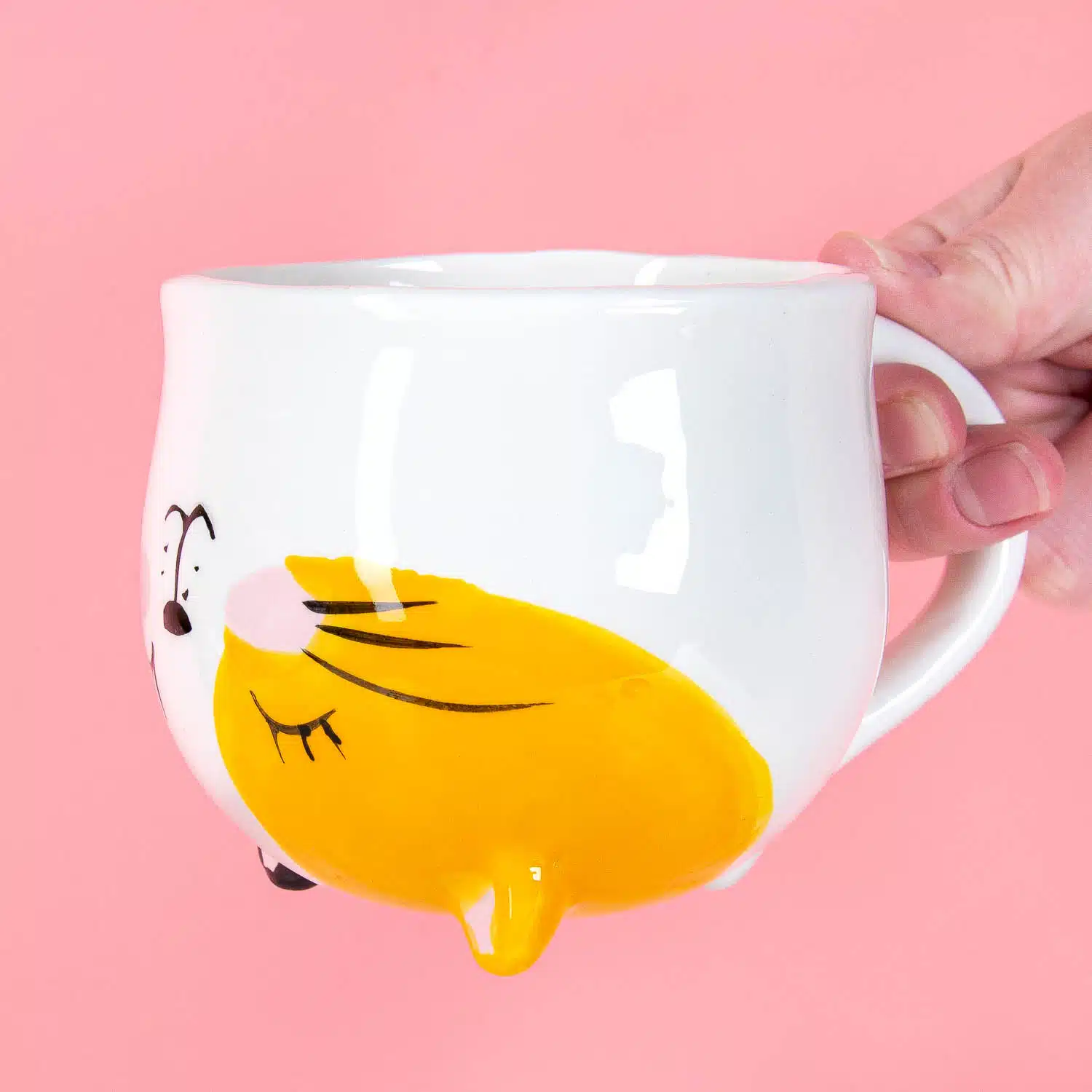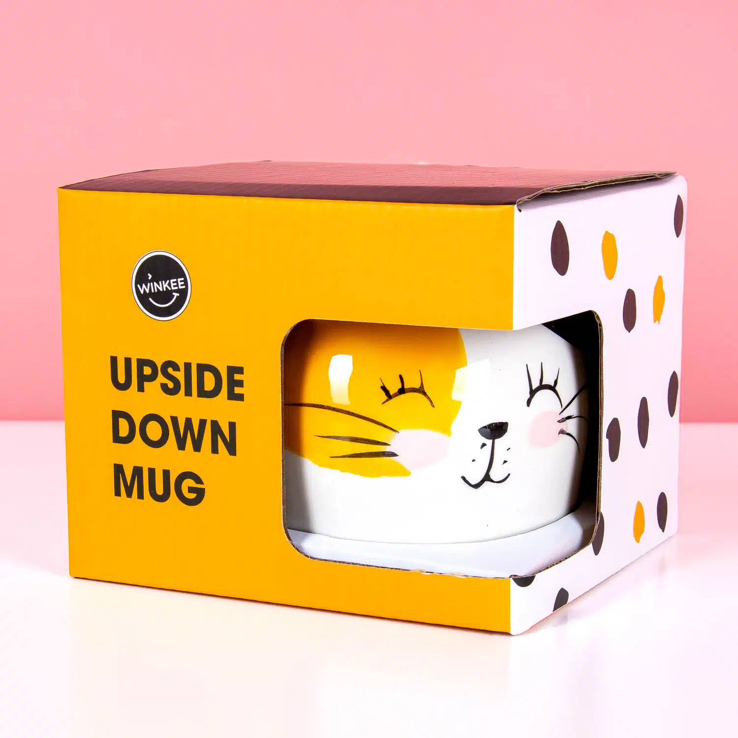 Waarom zou je een normale mok gebruiken, als je er ook eentje kunt hebben die op z’n kop staat? De Ondersteboven kat mok van Winkee is een kattenkop die op z’n oortjes staat wanneer je hem gebruikt. Met een lieve glimlach en gesloten oogjes, en leuke gekleurde vlekken. In de kast is het een schattig decoratiestuk, op tafel een koffiemok.