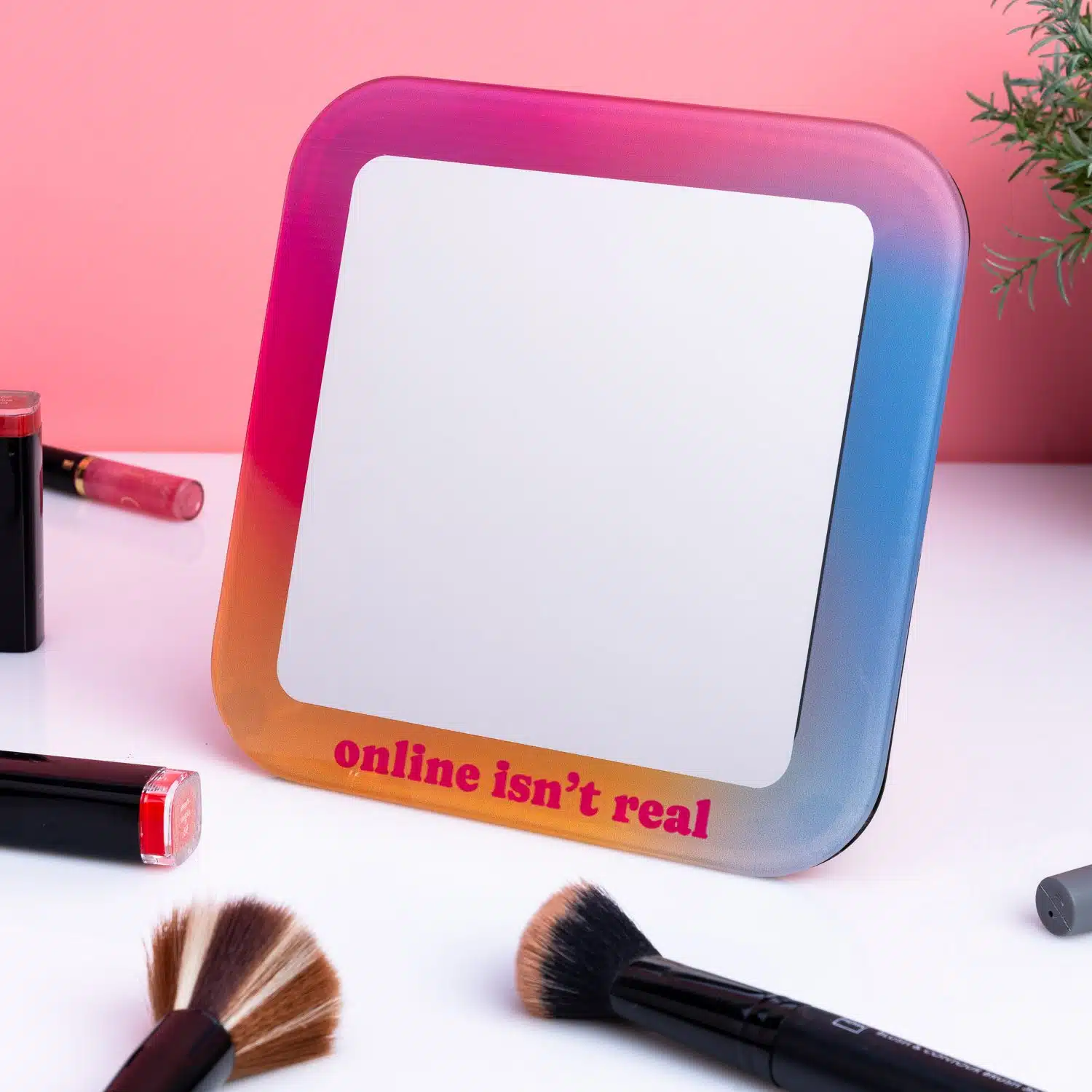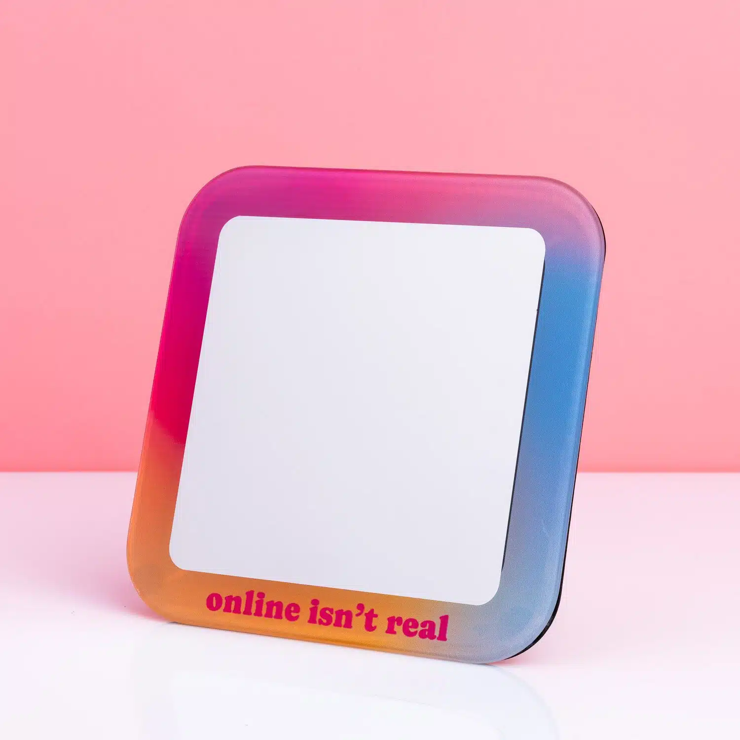 Social media kan een enorme invloed hebben op je zelfvertrouwen. Daarom is het goed om te onthouden dat het meeste wat je daar ziet, niet echt is. De Online Isn’t Real spiegel van Fisura helpt je eraan herinneren dat je niet alles moet geloven wat je online ziet en dat je goed bent zoals je bent. De spiegel heeft een vrolijk gekleurde rand die het goed doet op elke tienerkamer.