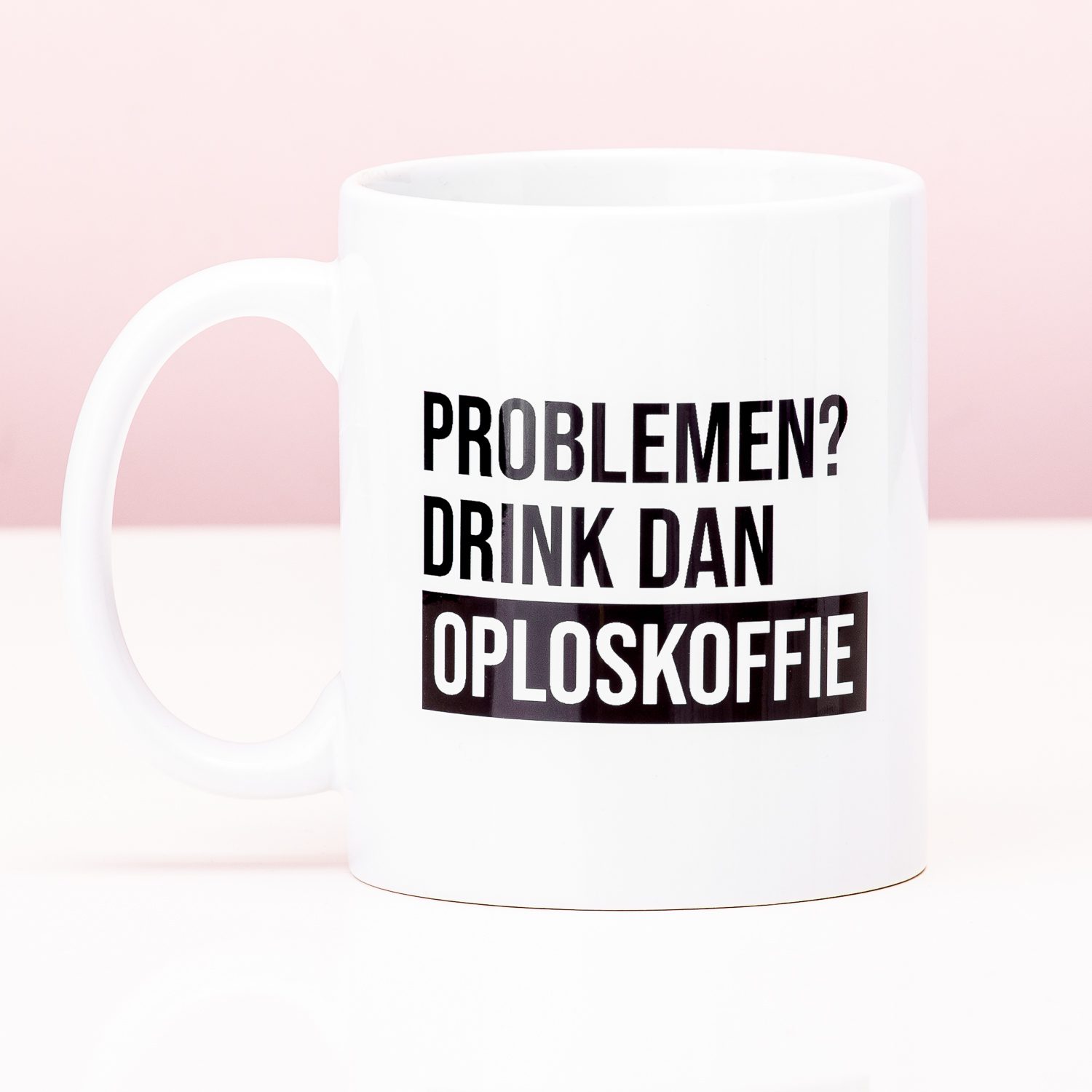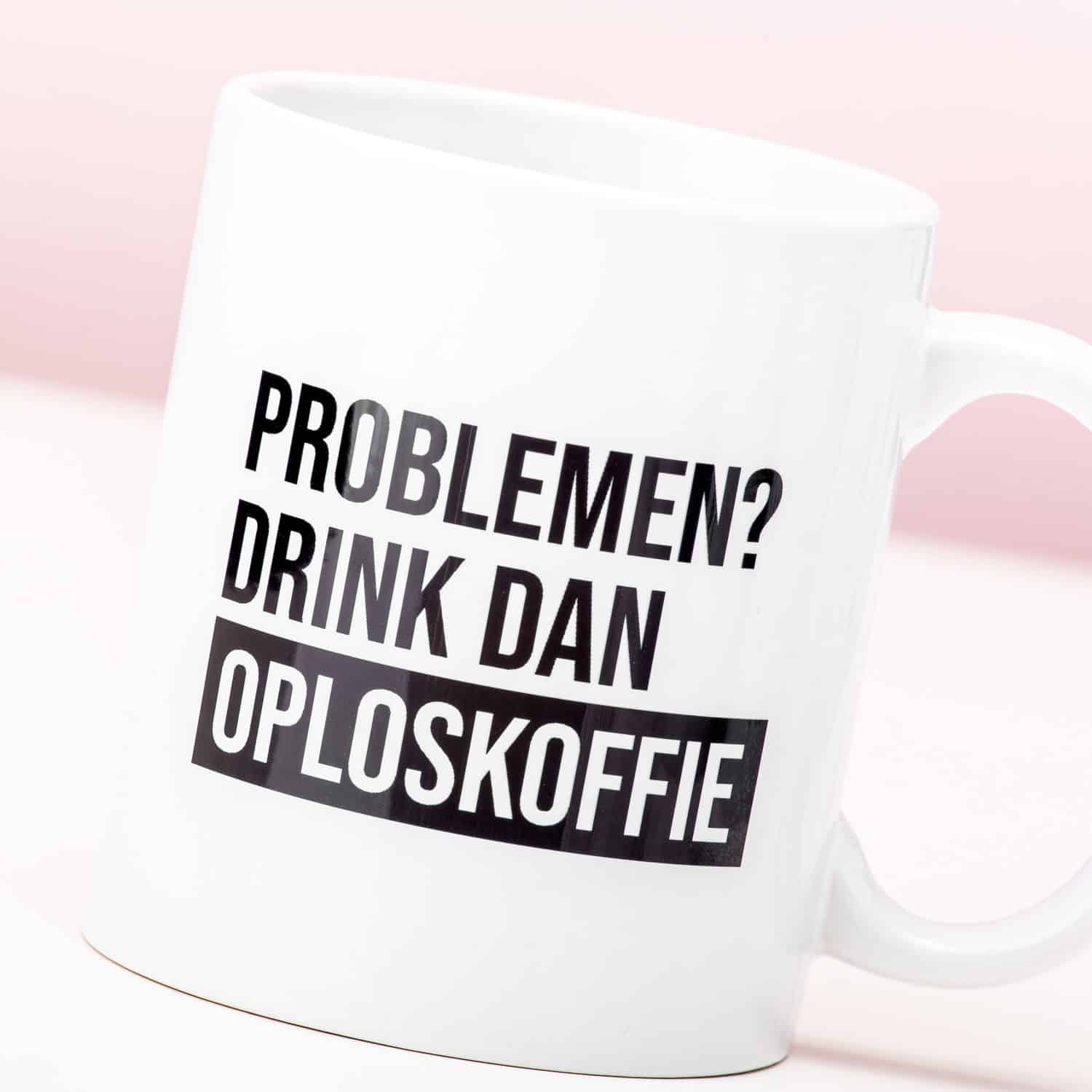 Oploskoffie: de meeste mensen zijn er geen fan van. Maar het kan heel handig zijn, om je te helpen met het oplossen van problemen. Oké, heel flauw. Maar de Oploskoffie mok, met de tekst: Problemen? Drink dan oploskoffie, zal een glimlach toveren op het gezicht van je collega’s of huisgenoten.
