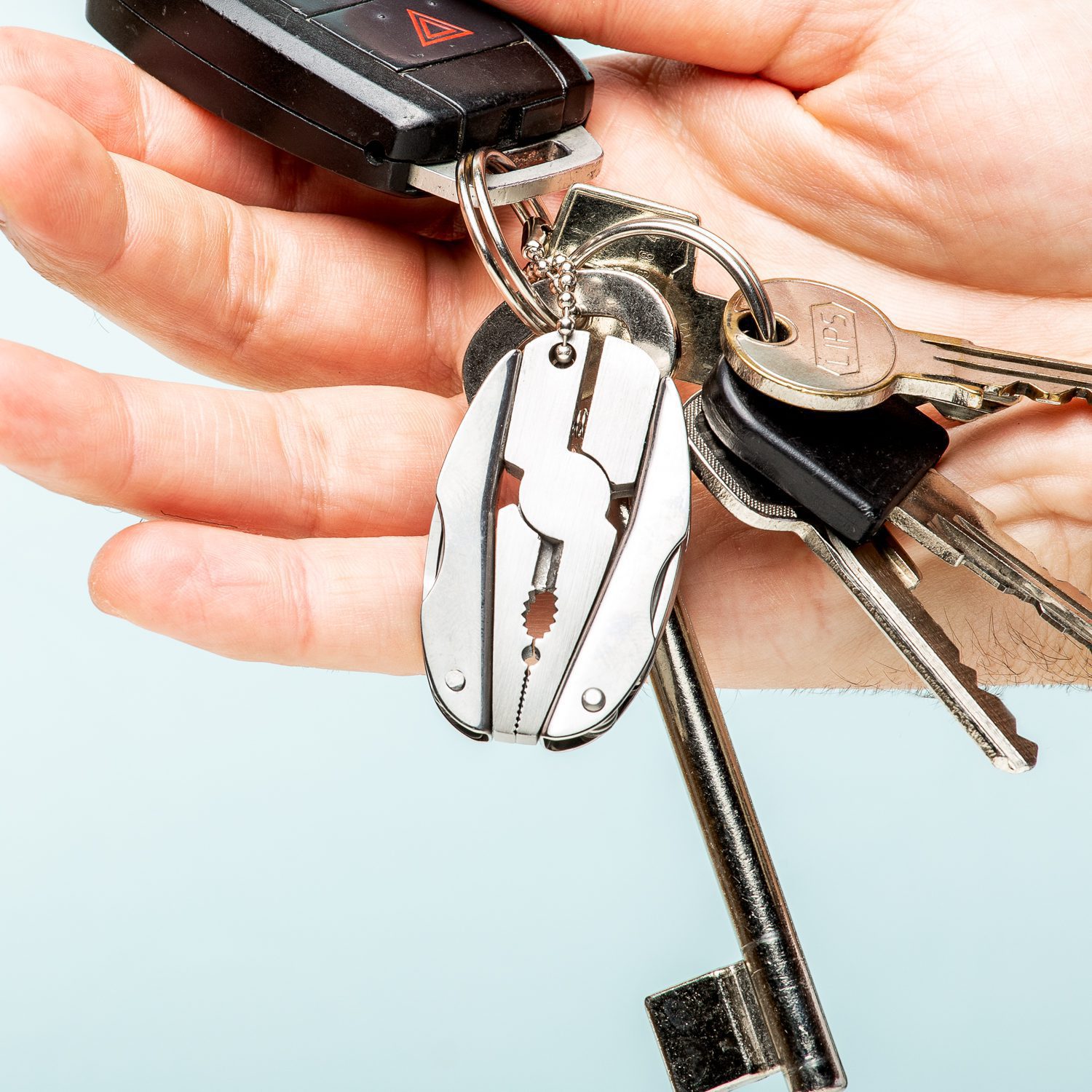 Vouw je de multitool open dan kom je als eerste een tang tegen. Handig als je opeens een roestige spijker uit het kozijn wilt trekken. Verder heeft ‘ie een mesje, een platte- en kruiskopschroevendraaier en een stalen vijl. Je hangt hem makkelijk aan je sleutelhanger met de bijgeleverde ketting. Inclusief opberghoesje. Je koopt de Scarab multitool online bij Ditverzinjeniet.nl.