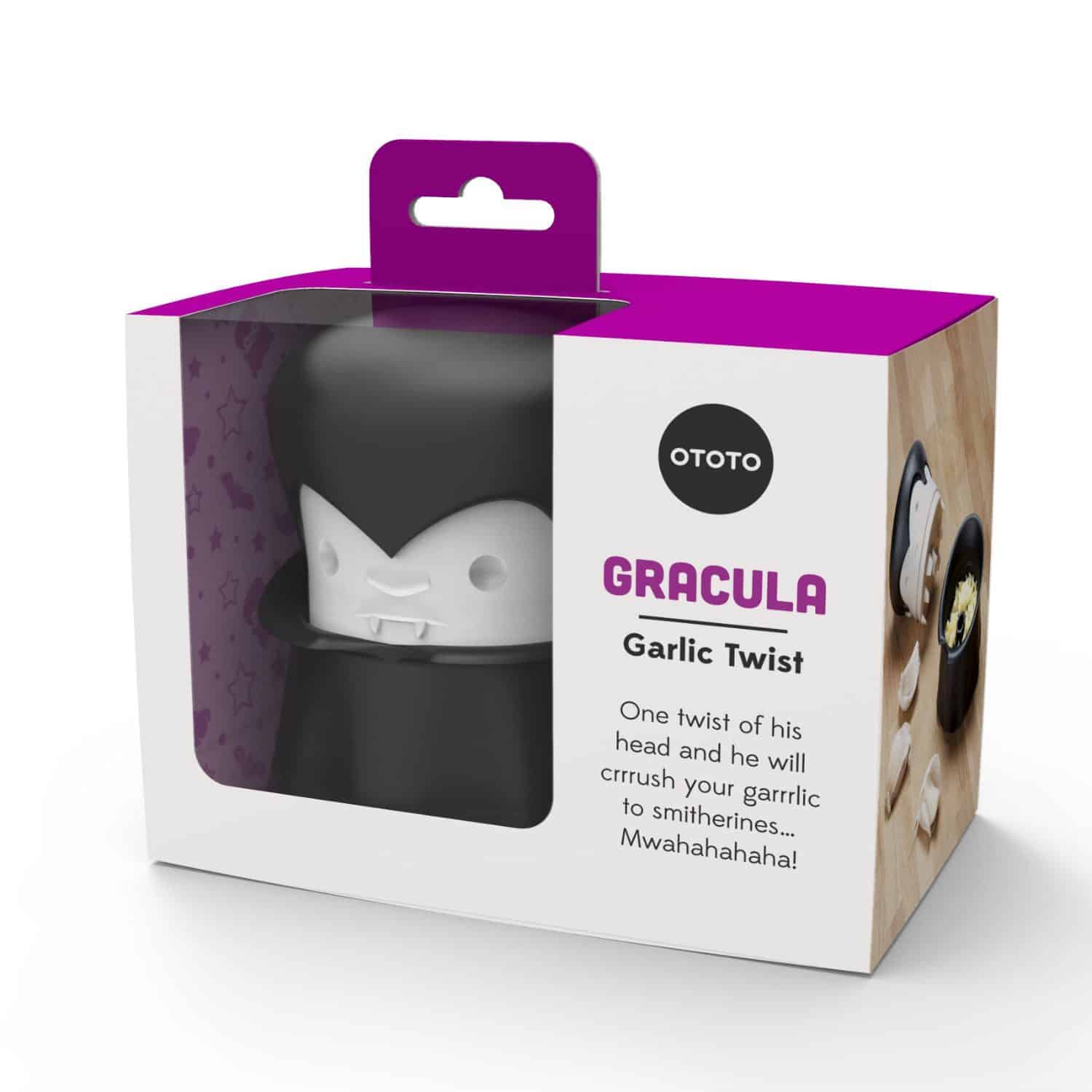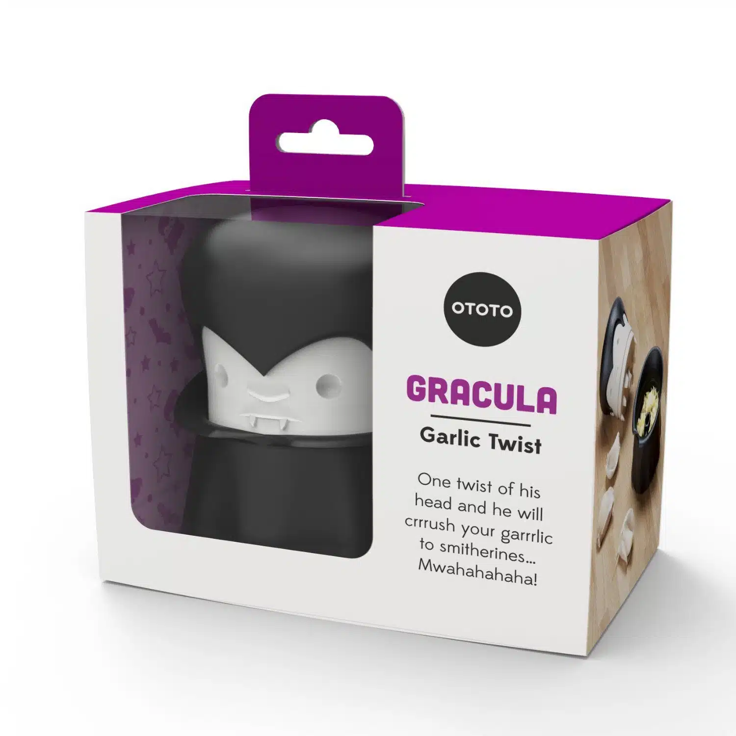 Op zoek naar een angstaanjagende knoflookpers? Deze Dracula is niet bang voor knoflook: Gracula knoflookpers van Ototo perst met alle liefde voor jou de knoflook. Iedere andere vampier zou snel weglopen bij het zien en ruiken van knoflook, maar dat doet deze Gracula gelukkig niet. Je kunt de knoflookteentjes in zijn zwarte gewaad stoppen en door één keer aan zijn hoofd te draaien, maal je de knoflook in kleine stukjes. Op die manier worden je gerechten een stuk intenser van smaak.