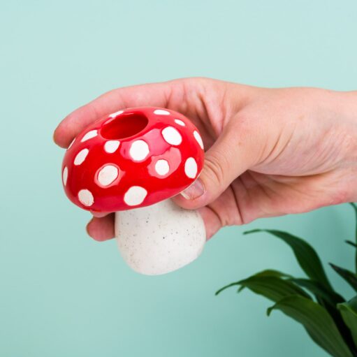 Ben jij helemaal op je plek in het bos? Tussen de gekleurde bladeren, het groene mos en de rood met witte paddenstoelen? Haal de romantische sfeer van het bos in huis met de Paddenstoel kandelaar van DOIY. Een vrolijke kandelaar van keramiek waar je een dinerkaars in kunt steken. Super leuk als je een speciale herfsttafel maakt, om te gebruiken tijdens een romantisch diner, maar natuurlijk ook gewoon als los woonaccessoire. Met deze paddenstoel kandelaar haal je de herfst in huis.