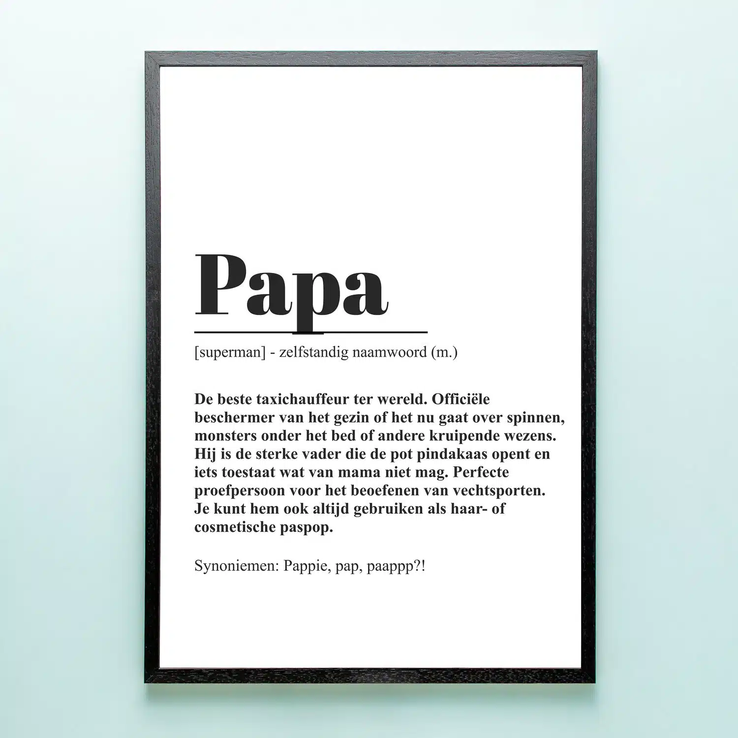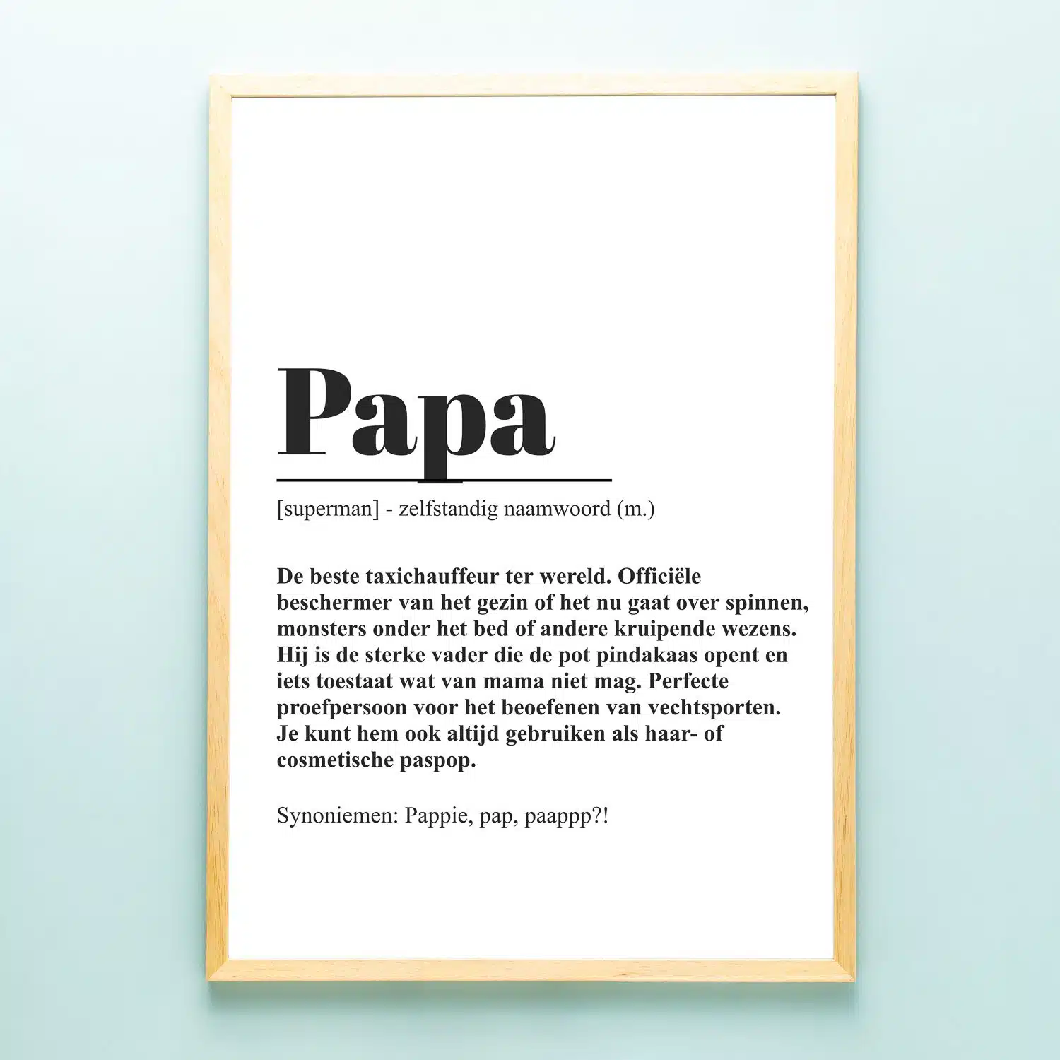 Wat zijn de leukste, beste eigenschappen van je vader? Heb je een speciale bijnaam voor hem? Verras hem met de Gepersonaliseerde poster Woordenboek papa. De poster heeft de uitstraling van een woordenboek. Papa, staat ook wel voor Superman. Hij is de beste taxichauffeur, de sterke man die de pindakaas kan openen en je beschermt tegen spinnen. Deze grappige poster is helemaal aan te passen, dus je kunt er ook een andere tekst op zetten. Geef je pa deze poster voor zijn verjaardag of Vaderdag: hij is er ongetwijfeld blij mee!