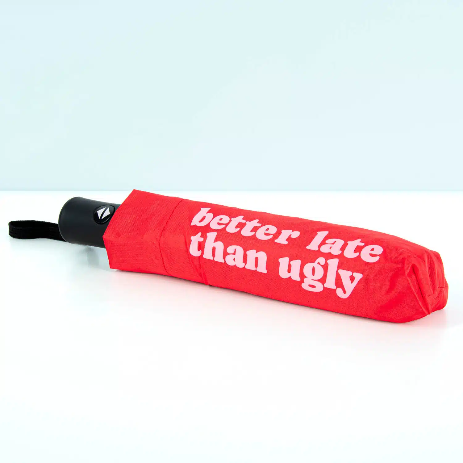 - Opvouwbare paraplu met tekst “Better Late Than Ugly”