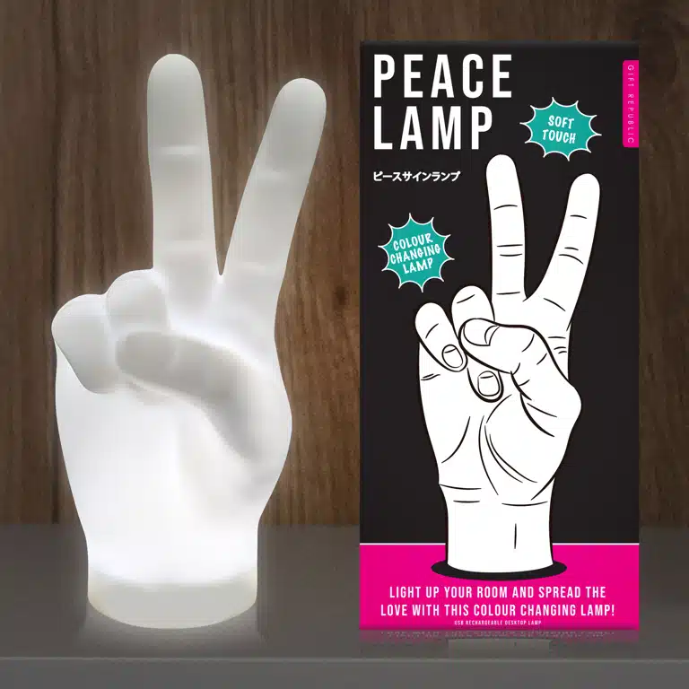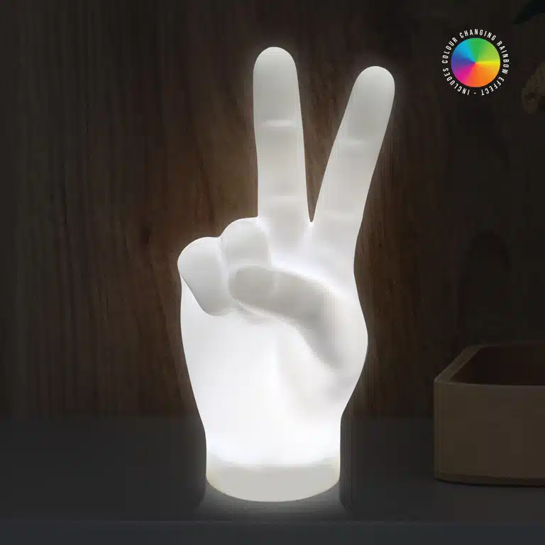 De Peace handteken lamp van Gift Republic is een lamp in de vorm van een peace-handteken die goede vibes uitstraalt. Knijp in de hand om te wisselen tussen drie witte lichtstanden of kies voor het kleurrijke regenboogeffect. Perfect cadeau voor tieners, festivalgangers of iedereen die van vrede, liefde en funky verlichting houdt. Good vibes only!