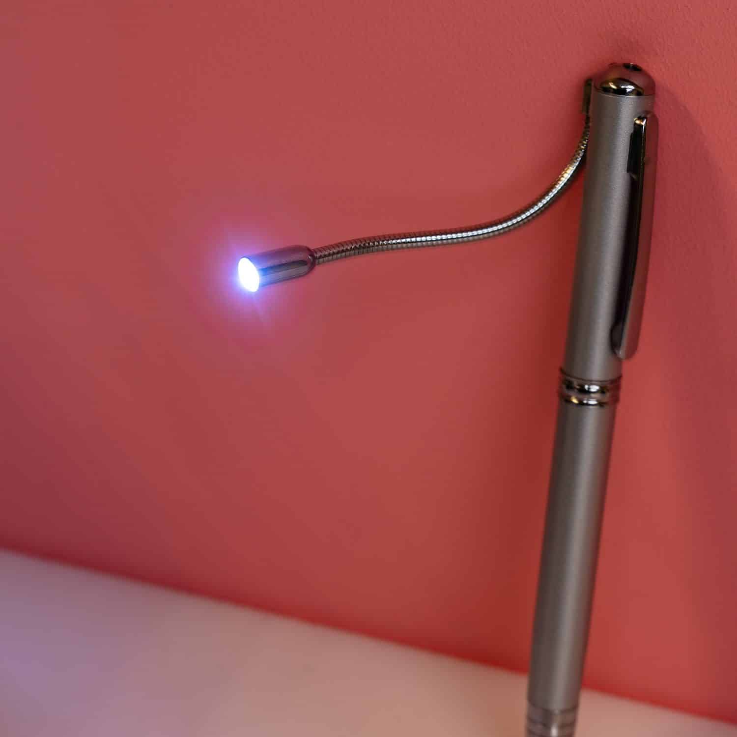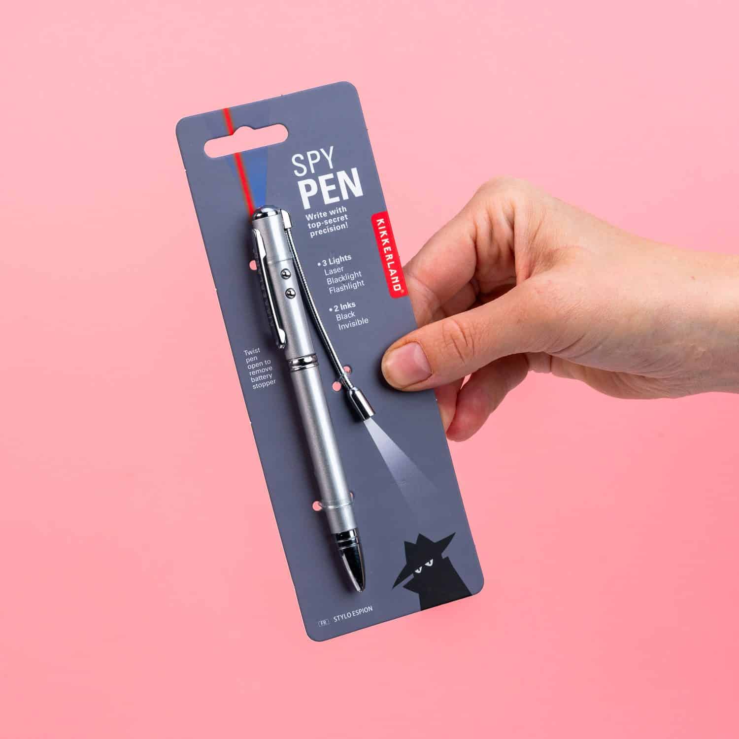 Of je nu een geheime boodschap wilt achterlaten of een boodschappenlijstje moet maken: de Pen met onzichtbare inkt en verlichting van Kikkerland is klaar voor zijn taak. Deze pen heeft twee soorten inkt: een onzichtbare variant en gewone zwarte inkt. De onzichtbare inkt is alleen leesbaar als de blacklight gebruikt: dit lampje zit aan de bovenkant van de pen. Daarnaast heeft de pen nog een laser en een klein zaklampje aan een flexibele stang. Je kunt er dus ook mee schrijven in het donker. Deze veelzijdige pen is een aanwinst voor iedereen die liever pen en papier gebruikt dan z’n telefoon.