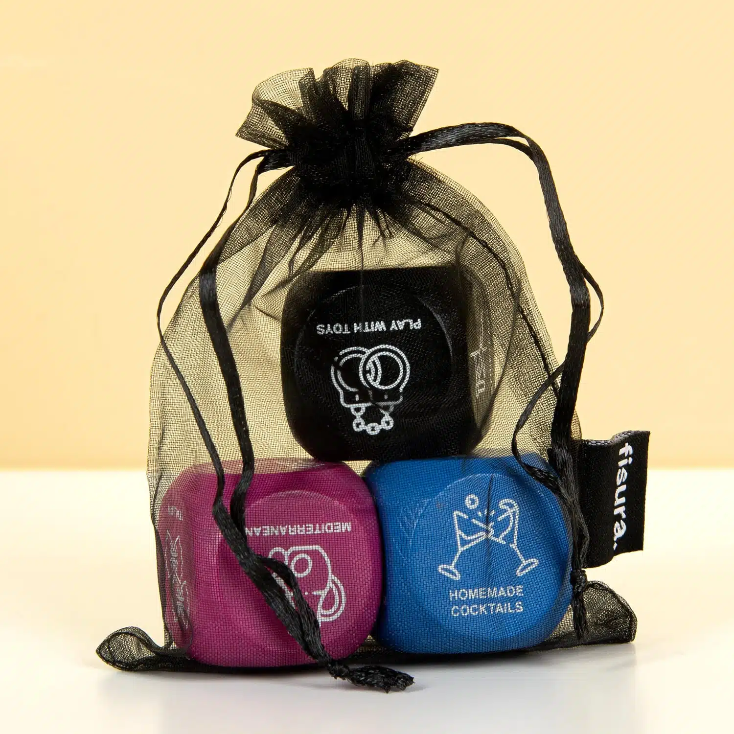 Ziet jouw ideale date er zo uit? Wil je eerst lekker sushi eten, dan naar de spa en als afsluiter geblinddoekt worden? Of ga je liever pizza eten, dan een spelletje doen en eindigen met een massage? Met de Perfecte date dobbelsteenset van Fisura weet je nooit hoe je datenight gaat verlopen: de dobbelstenen bepalen namelijk wat er gaat gebeuren! Deze drie dobbelstenen vertellen je wat je gaat eten, welke activiteit jij en je partner gaan doen tijdens jullie datenight en tot slot hoe spannend de avond eindigt.