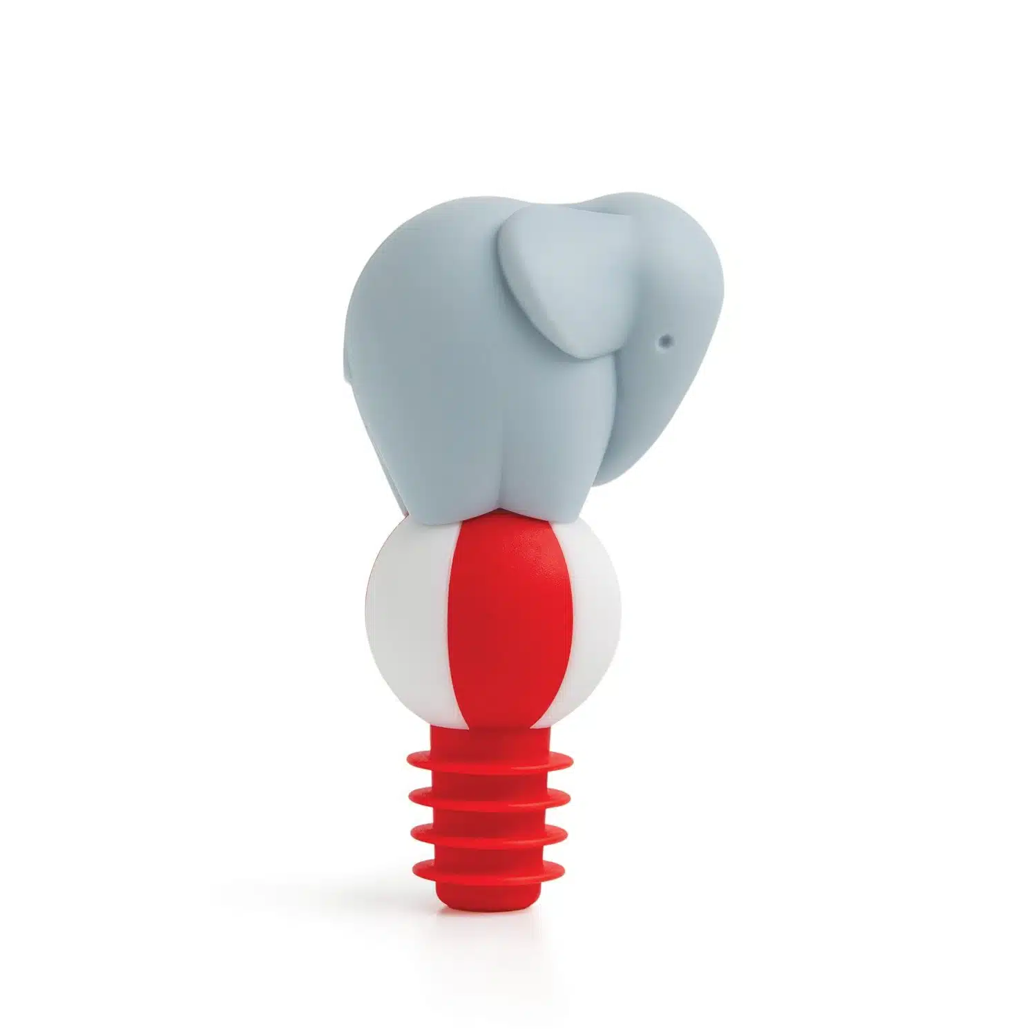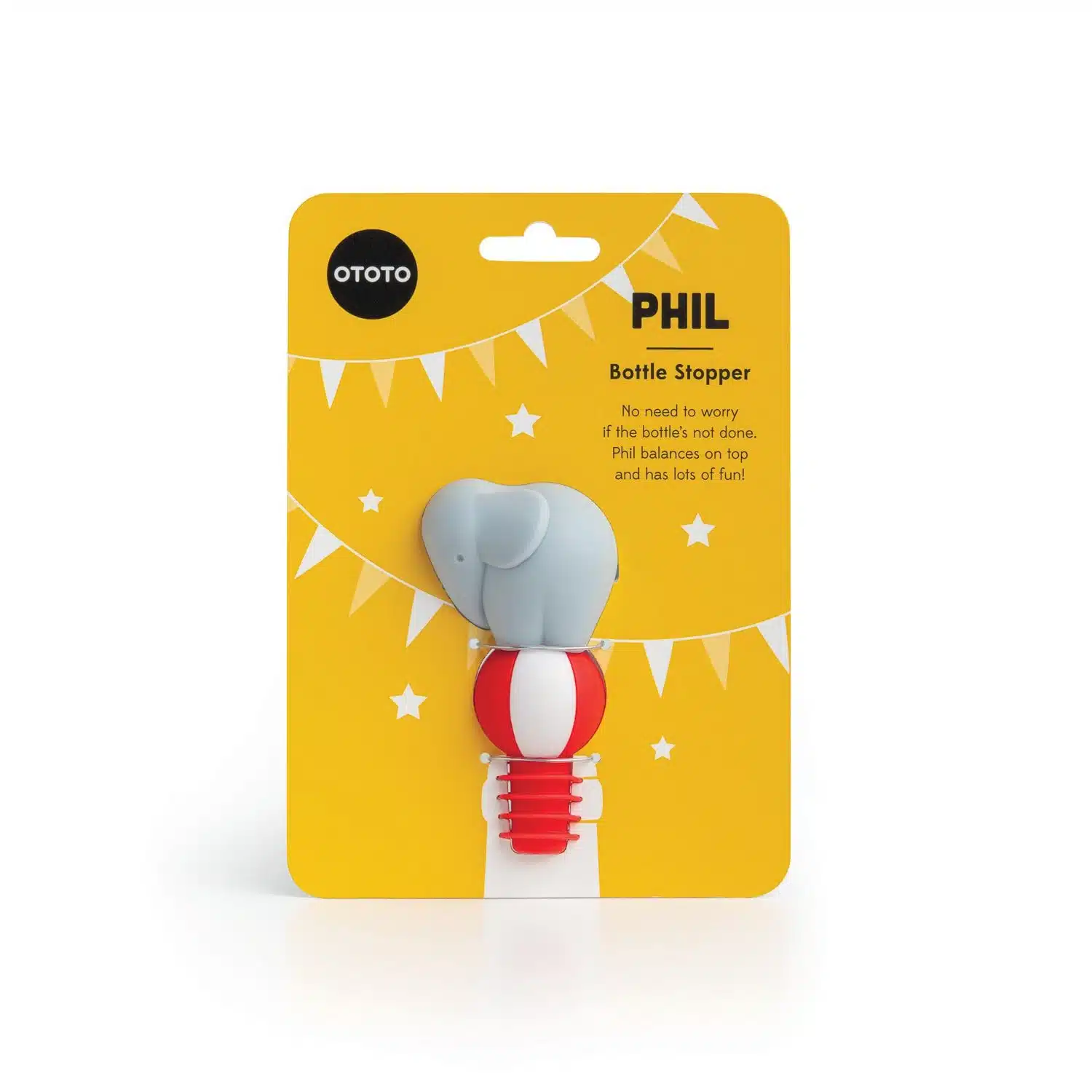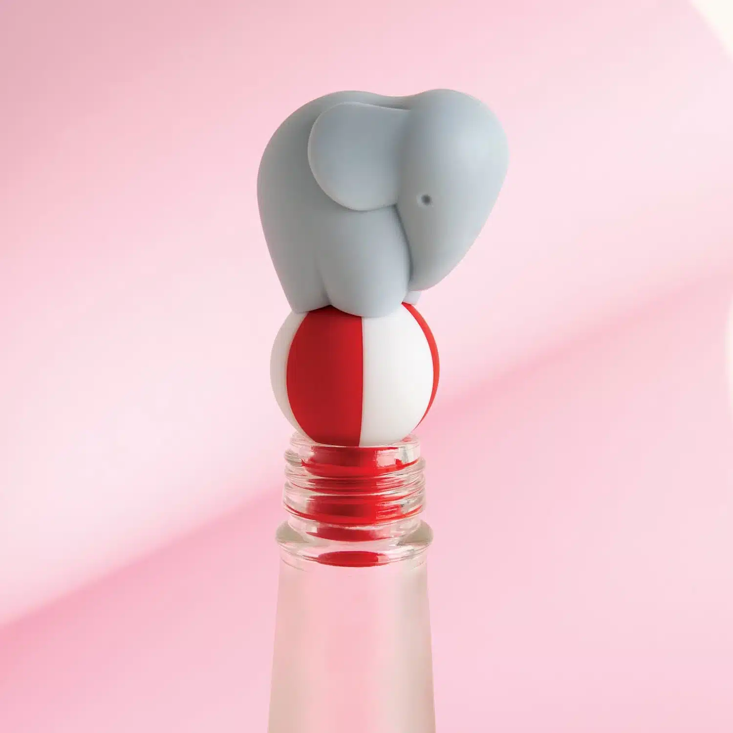 Heb je per ongeluk de kurk kapot gedraaid tijdens het ontkurken van een flesje rood? Dan kun je drie dingen doen: je koopt voortaan alleen nog flessen wijn met schroefdop, je drinkt de hele fles leeg óf je gebruikt de Phil wijnstopper van Ototo. Met deze flesstopper kun jij de wijnfles luchtdicht afsluiten, zodat de wijn extra lekker blijft. Phil is een olifant die in het circus werkt: daarom balanceert hij op een rood met witte bal.