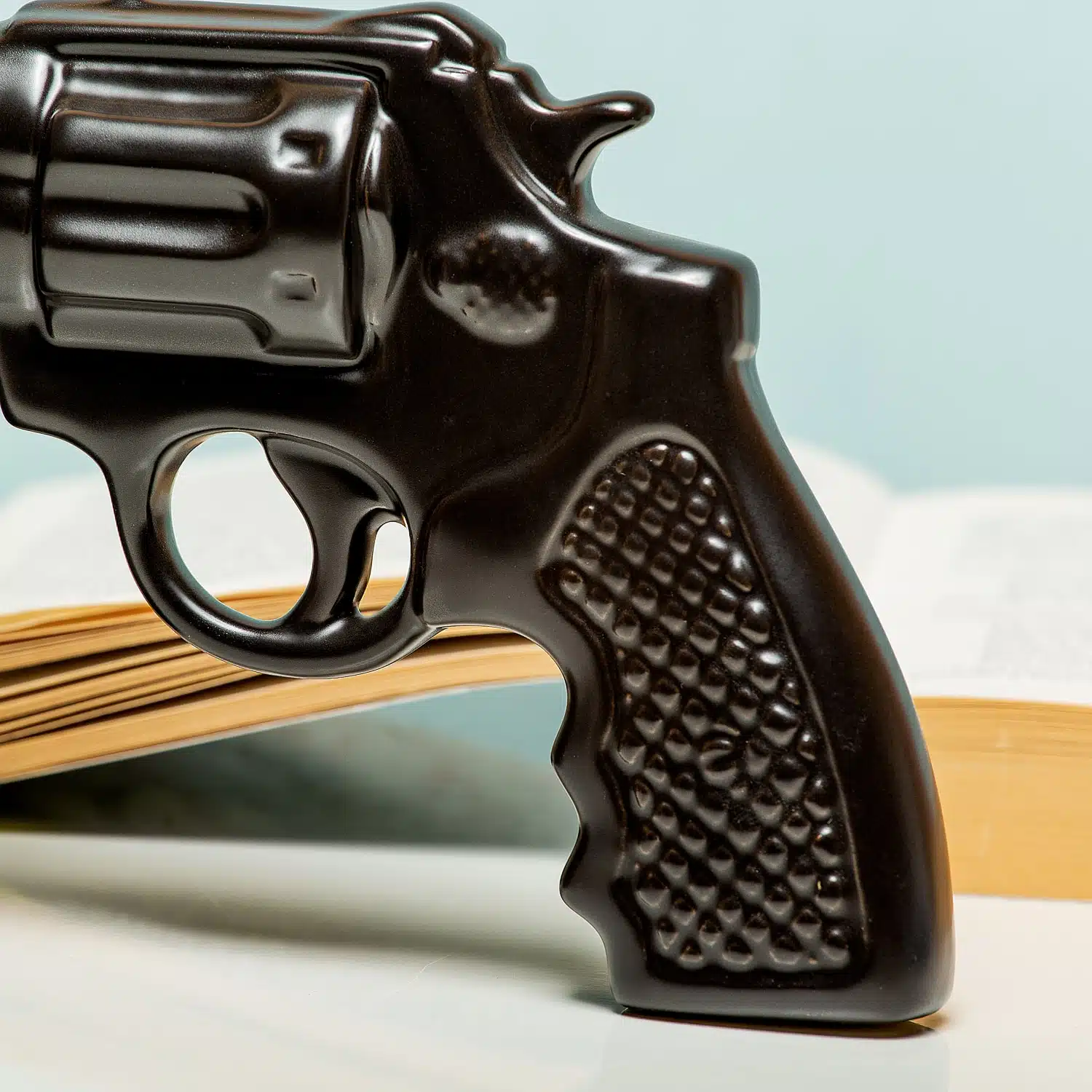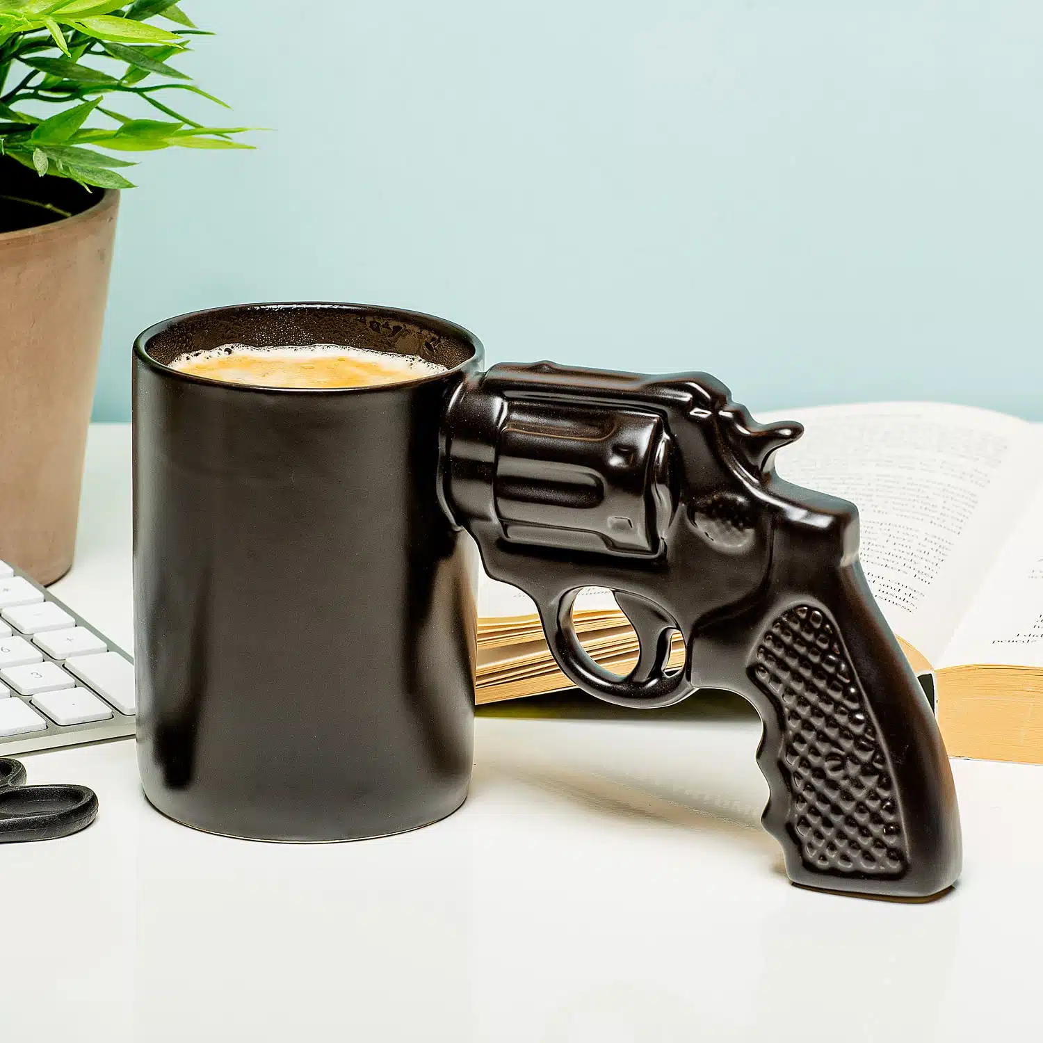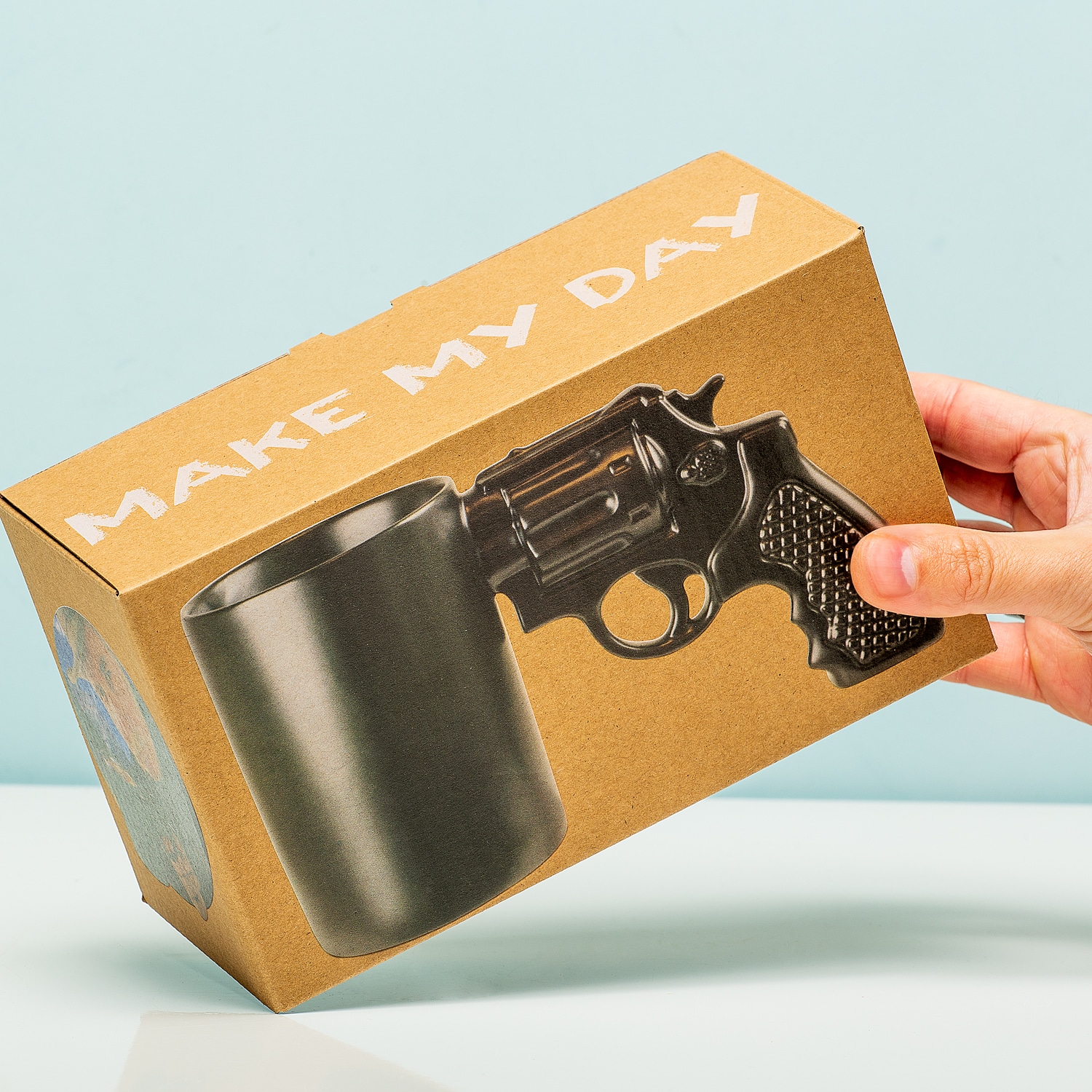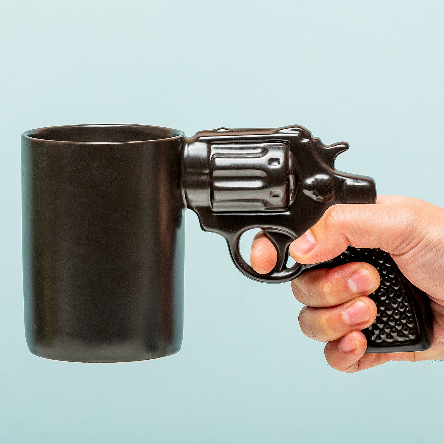 Wie kent hem niet: de bekende quote die uit werd gesproken door Clint Eastwood in Sudden Impact. ‘Go ahead, make my day’. Dirty Harry deinst er in de film niet voor terug om zijn pistool te gebruiken en wij doen dat ook niet. Wij grijpen onze Pistoolmok van Invotis elke ochtend uit de kast en drinken er dan heel stoer koffie uit. De mok is een indrukwekkend exemplaar, met een handvat van een pistool eraan. Het handvat is stevig genoeg om je mok hier echt mee vast te houden.