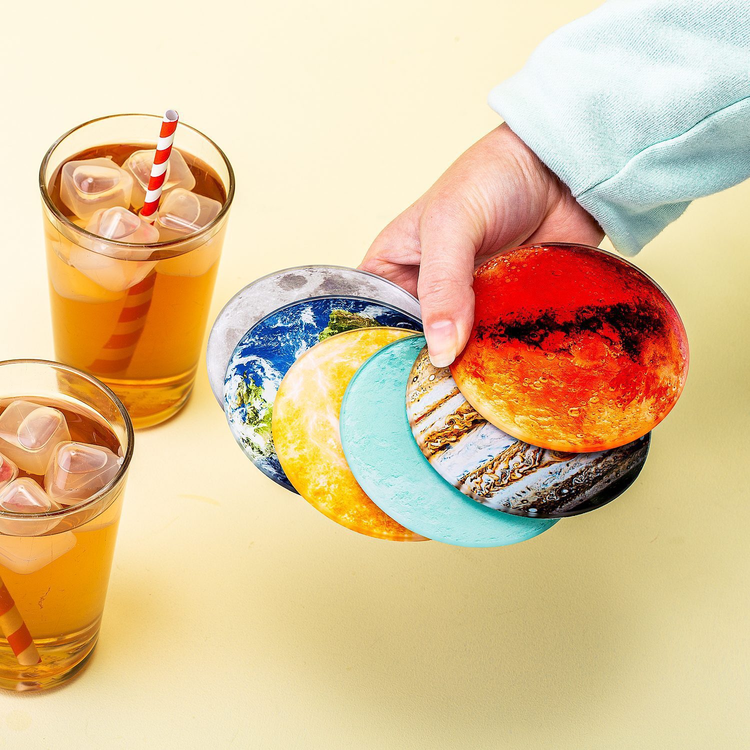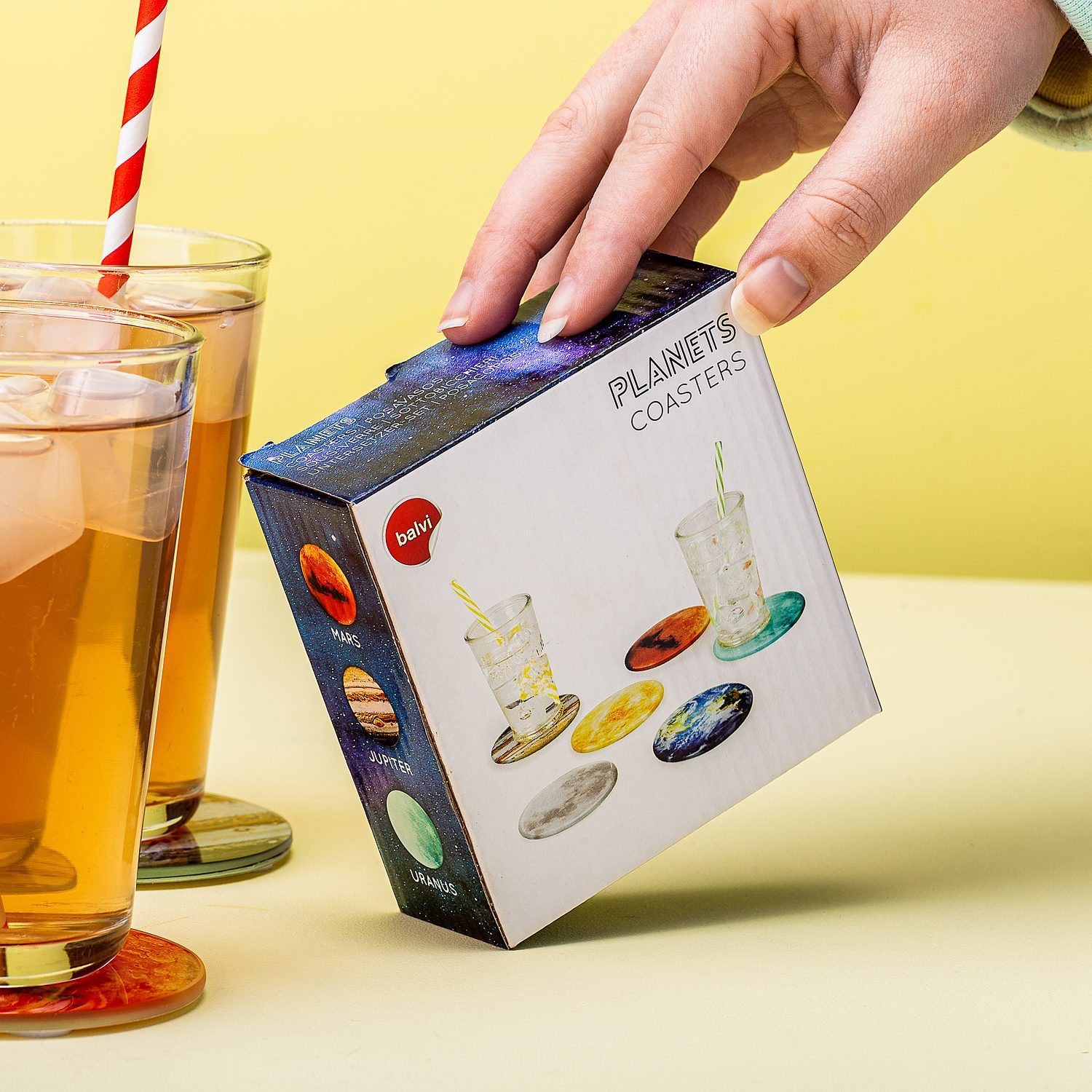 Krassen en kringen op je mooie tafel zijn verleden tijd met de Planeet onderzetters van Balvi. In deze set van zes zitten onderzetters die eruit zien als planeten. Je ontvangt de zon en maan, aarde, Mars, Jupiter en Uranus. De onderzetters zijn gemaakt van glas en komen in een handig opbergbakje, die je op tafel kunt zetten. Ben jij dol op ons sterrenstelsel en wil je er alles over weten? Dan zijn deze onderzetters alvast een leuk begin. Ook leuk om cadeau te geven aan iemand die op zichzelf gaat wonen.