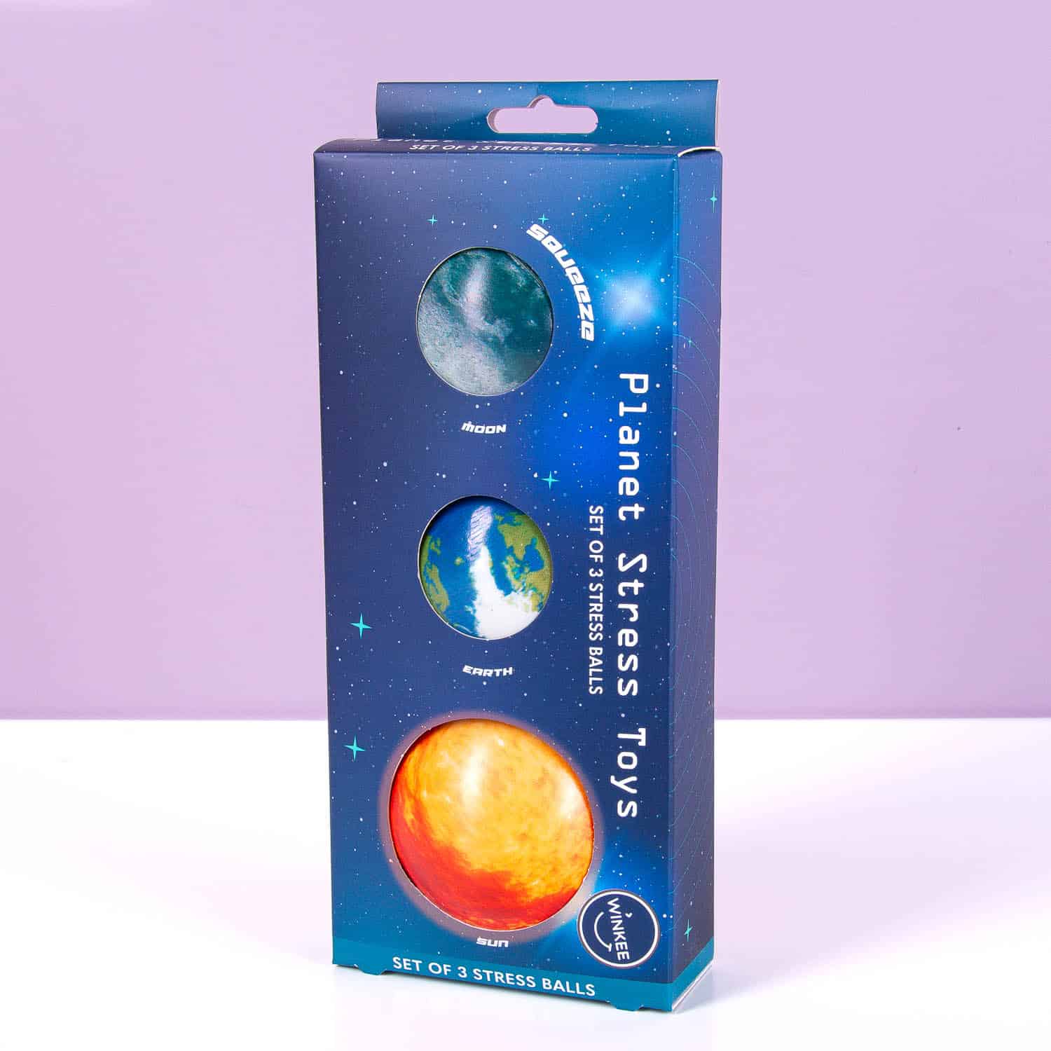 Knijp je stress weg met deze Planeet stressballen van Winkee. Deze set bevat drie stressballen – de zon, de maan en de aarde – elk in verschillende formaten. Kies de juiste bal afhankelijk van je stressniveau. Perfect om mee te knijpen tijdens examens, op kantoor of gewoon thuis. Een perfect cadeau voor examenkandidaten, gefrustreerde types en iedereen die stress van zich af wil knijpen!