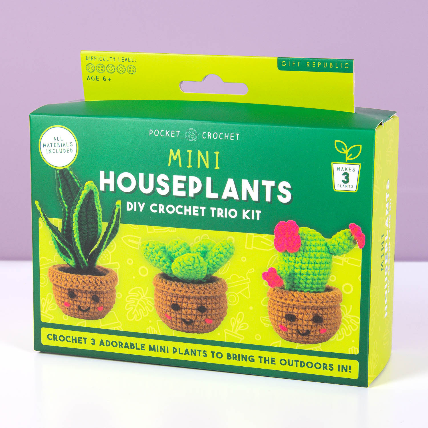 Ben je een ster in het vermoorden van planten? Met de Planten haakset van Gift Republic haak je drie schattige plantjes met elk een eigen gezichtje, die met geen mogelijkheid dood te krijgen zijn. Ze hebben geen water nodig, verwelken niet en staan super schattig in je vensterbank. De set bevat alles wat je nodig hebt om direct te beginnen: van garen tot instructies.