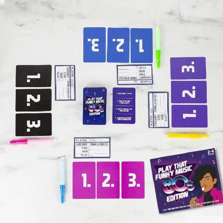 Tijd voor een nostalgische trip! Play that Funky 80s Music van Gift Republic test je kennis van iconische 80s hits, van bijvoorbeeld Prince of Queen. Met 150 songkaarten en drie manieren om het te spelen: zing, neurie of speel op een schuiffluitje. Perfect voor feestjes met vrienden, 80s themed parties of als cadeau voor wie opgroeide met de beste muziek ooit.