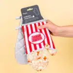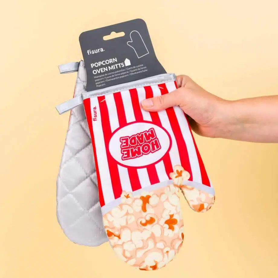 Is de popcorn te heet om uit de magnetron te pakken? Gebruik dan de Popcorn ovenwanten (set van 2) van Fisura! Deze handige ovenwanten beschermen je handen tegen de hitte van hete ovenschalen en pannen. En natuurlijk kun je ze dus gebruiken om een zak vers gepofte popcorn uit de magnetron te pakken. In de set zitten twee ovenwanten, want anders krijg je alsnog last van zere vingers.
