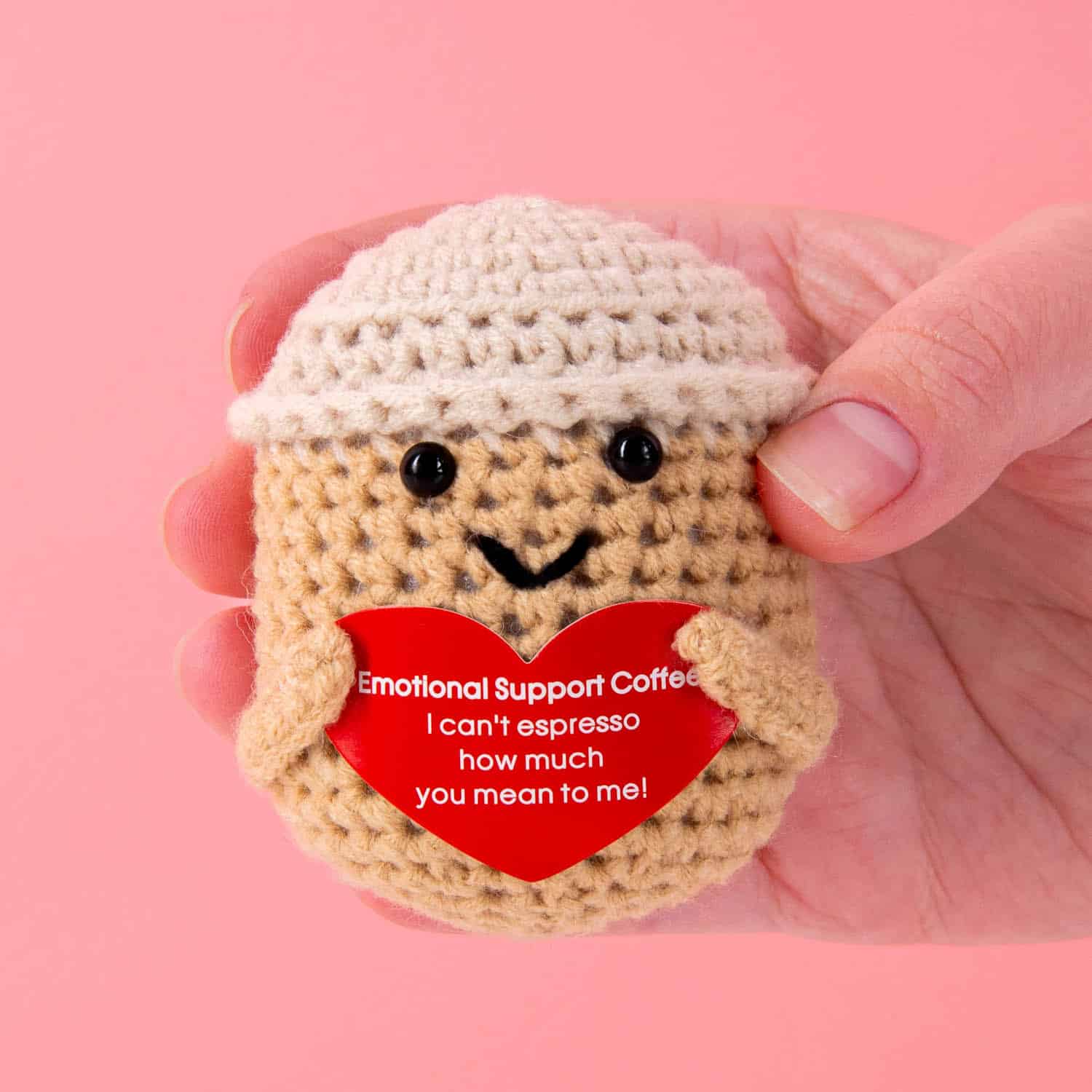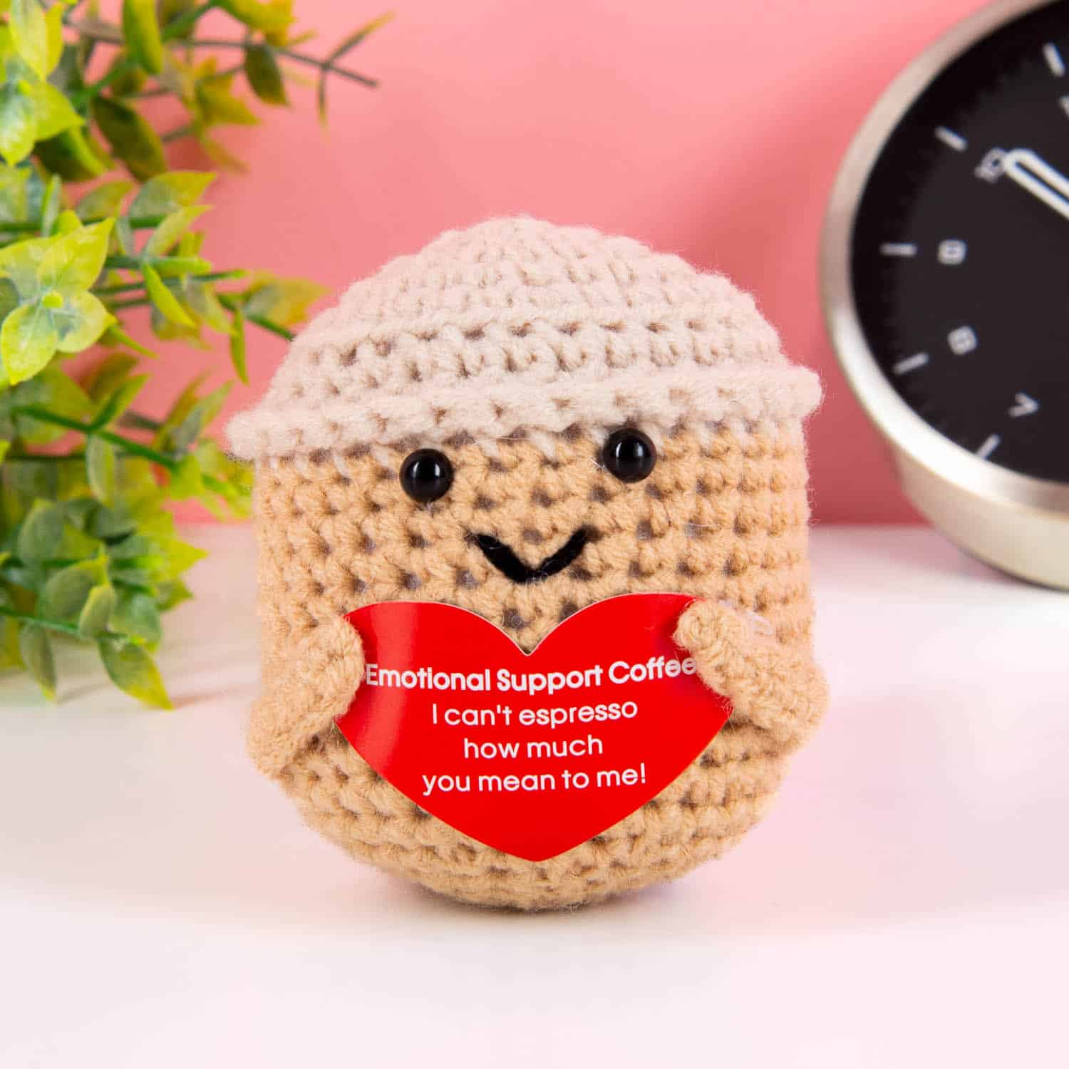 De Positieve espresso kop is een lieve en motiverende oppepper, in de vorm van een gehaakt kopje. Het is een lief, klein cadeautje om je vriendin te troosten, die net is gedumpt door haar vreselijke vriend. Of voor je zus, die steeds pech lijkt te hebben. Dit positieve espressokopje heeft een hartje in haar handen, met daarop de tekst: Emotional support coffee. I can’t espresso how much you mean to me! Een lief en populair cadeautje, dat zeker gewaardeerd zal worden.