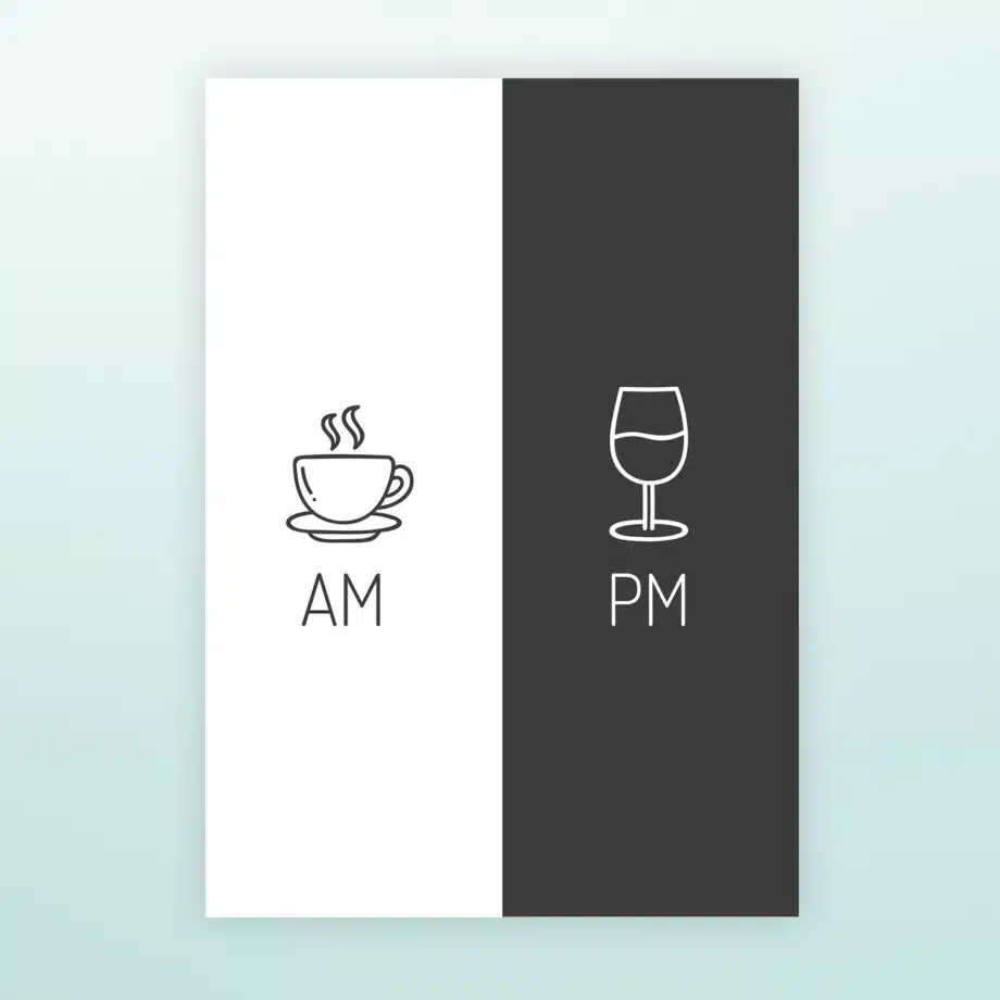 Ergens ter wereld zit de vijf in de klok of het is al middag: er worden nergens zoveel smoesjes voor verzonnen als voor het drinken van een glas wijn. Deze Poster koffie en wijn laat je zien welk dagdeel geschikt is voor welk drankje. Bij AM staat een kop en schotel met koffie tegen een witte achtergrond. Daarnaast zie je bij PM een wijnglas tegen een zwarte achtergrond. Dat wil zeggen dat je vanaf 12 uur ‘s middags best met goed fatsoen al een flesje open kunt trekken. Grappige poster om bijvoorbeeld in je keuken op te hangen.