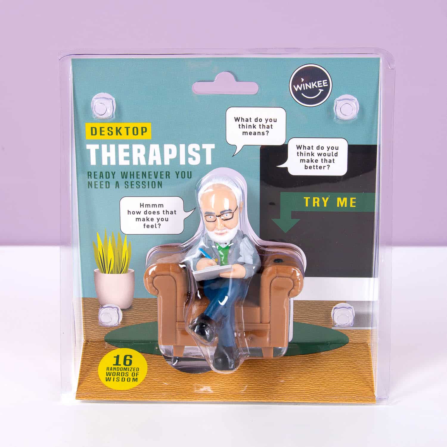 Stressvolle dag op kantoor en heb je dringend hulp nodig? De Pratende bureautherapeut van NPW is er om je door moeilijke momenten heen te helpen. Druk op het knopje en je hoort één van de 16 verschillende Sigmund Freud quotes in het Engels, zoals “How are you feeling today?”, “What was your childhood like?” en “Keep going…”. Het heeft niet alleen een rustgevend effect, maar brengt ook een glimlach op je gezicht. Een hilarisch cadeau voor collega’s of iedereen die af en toe een luisterend oor kan gebruiken!