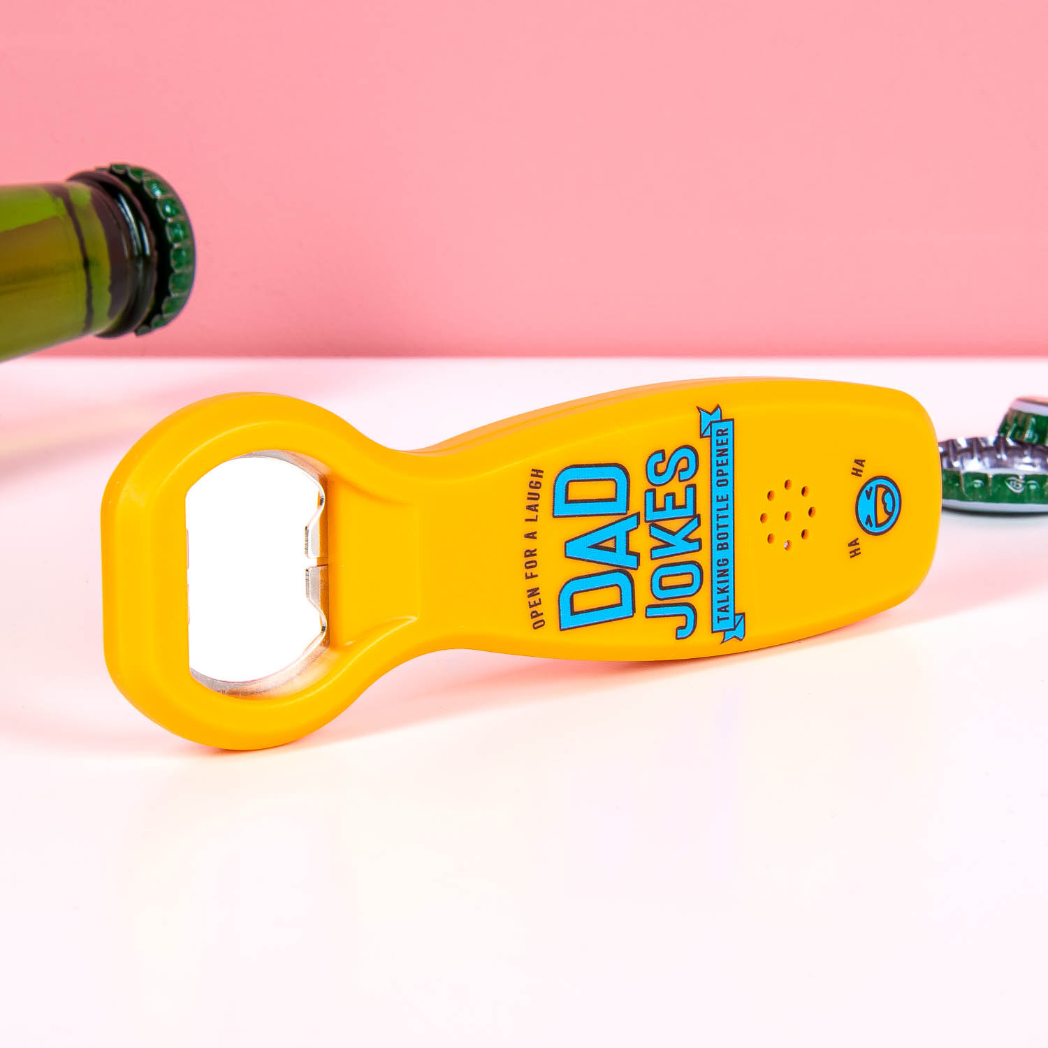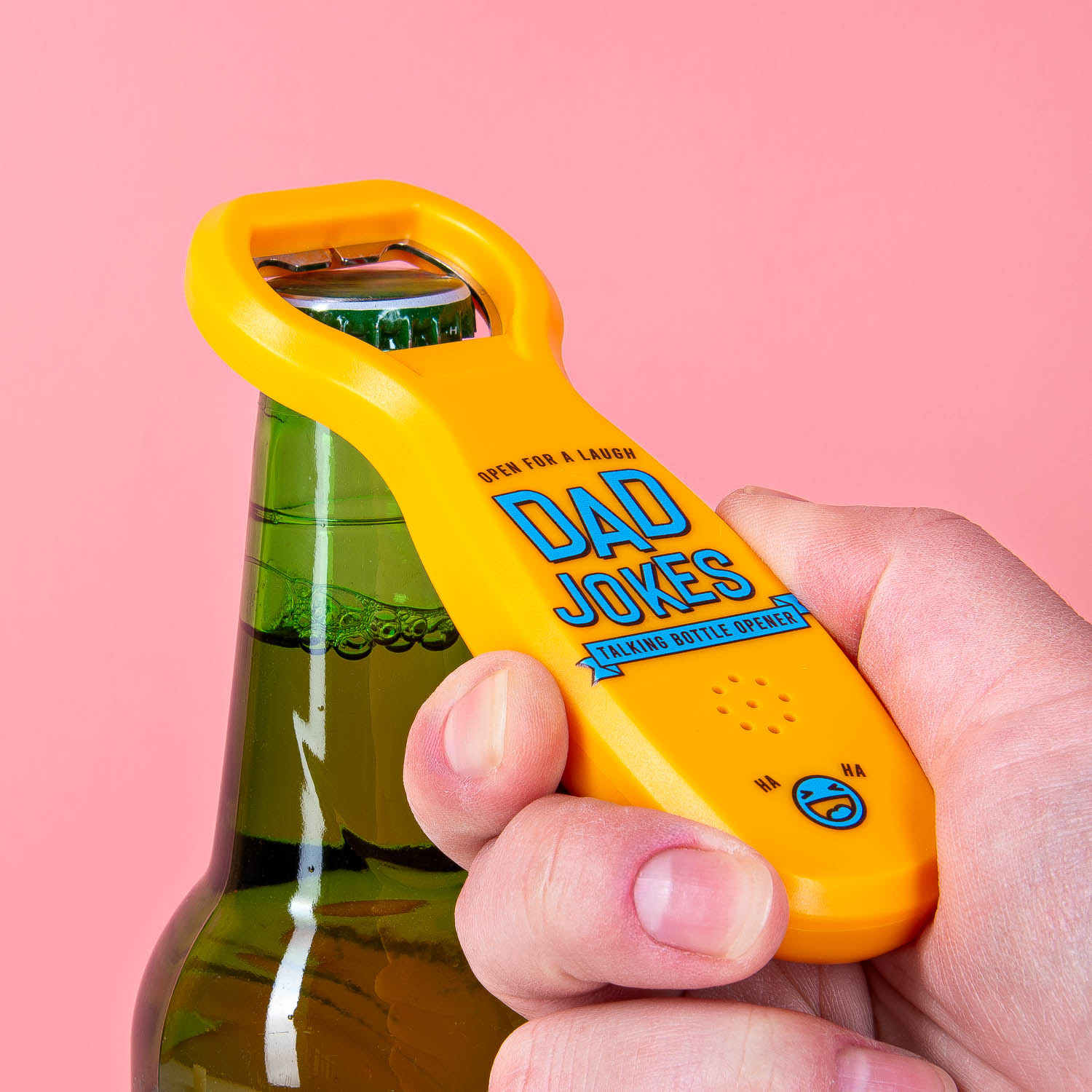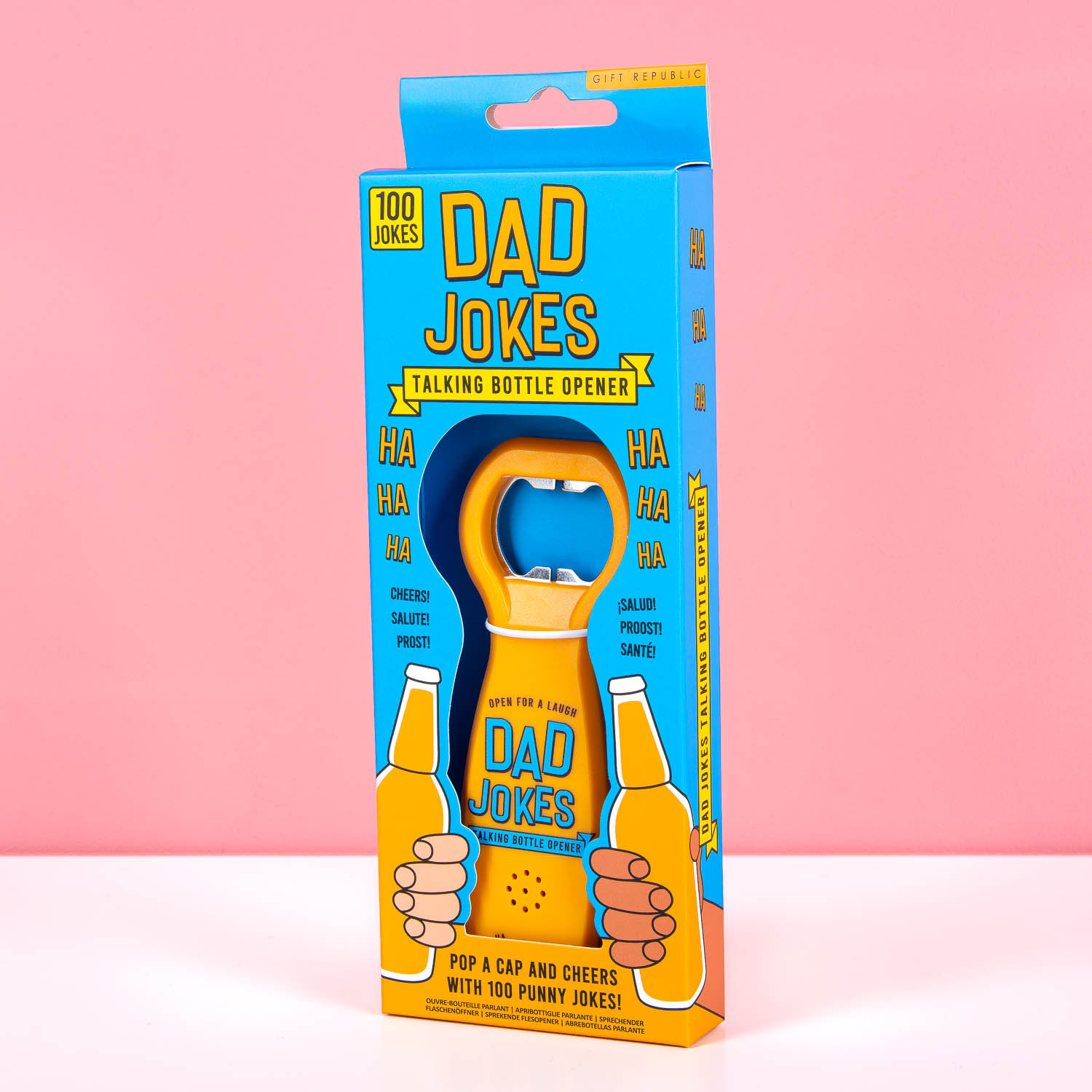 Flesje open, grap eruit. De Pratende Dad Jokes flesopener van Gift Republic is geladen met 100 klassieke dad jokes: het soort grappen waar je met je ogen rolt, maar toch om moet lachen. Druk op de knop na het openen en laat je vader (of jezelf) stralen. What do sprinters eat before a race? Nothing, they fast.