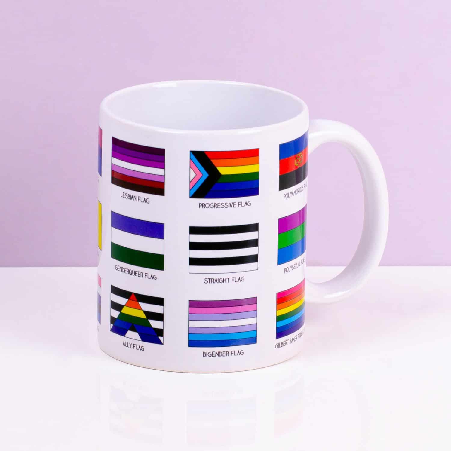 • Op de mok staan o.a. de transgender-, genderfluïde- en aromantische vlag